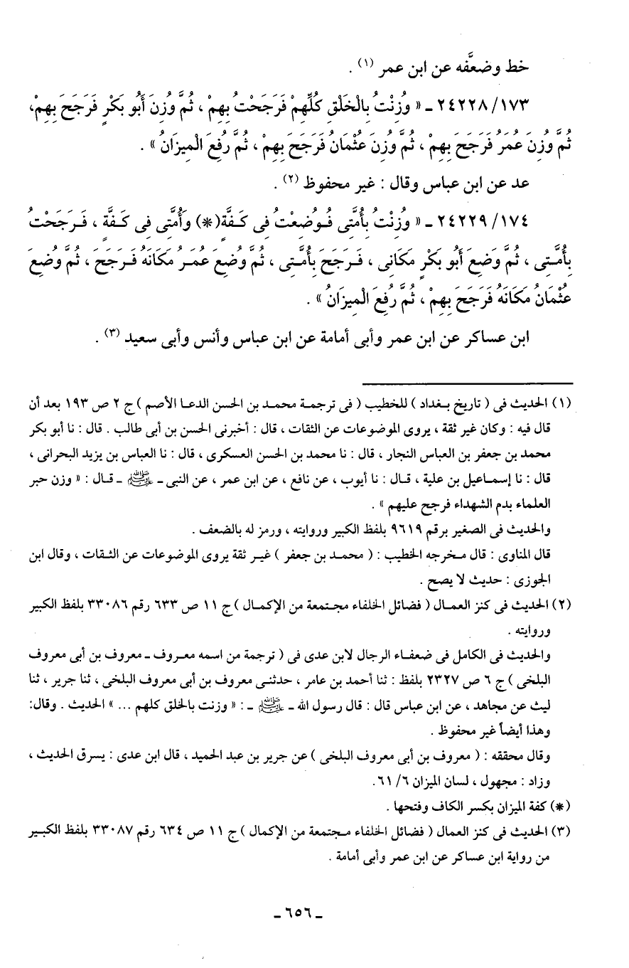 174/ 24229 - "وُزِنْتُ بِأُمَّتِي فُوُضِعْتُ فِي كَفَّةٍ (*) وَأُمَّتِي فِي كَفَّةٍ، فَرَجَحْتُ بِأُمَّتِي، ثُمَّ وَضِعَ أَبُو بَكْرٍ مَكَانِي، فَرَجَحَ بِأُمَّتِي، ثُمَّ وُضِعَ عُمَرُ مَكَانَهُ فَرَجَحَ، ثُمَّ وُضِعَ عُثْمَانُ مَكَانَهُ فَرَجَحَ بِهِمْ، ثُمَّ رُفِعَ الْمِيزَانُ".