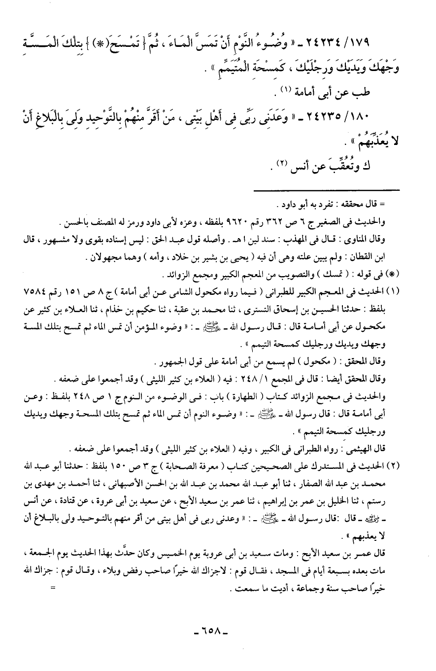 (¬1) الحديث في المعجم الكبير للطبراني (فيما رواه مكحول الشامي عن أبي أمامة) ج 8 ص 151 رقم 7584 بلفظ: حدثنا الحسين بن إسحاق التستري، ثنا محمد بن عقبة، ثنا حكيم بن خذام، ثنا العلاء بن كثير عن مكحول عن أبي أمامة قال: قال رسول الله - صلى الله عليه وسلم -: "وضوء المؤمن أن تمس الماء ثم تمسح بتلك المسة وجهك ويديك ورجليك كمسحة التيمم".