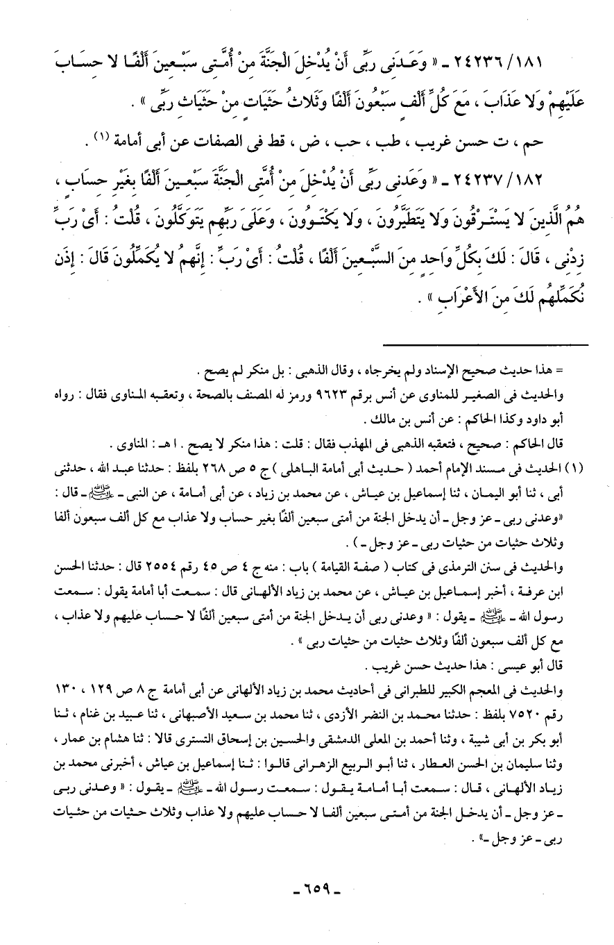 (¬1) الحديث في مسند الإمام أحمد (حديث أبي أمامة الباهلي) ج 5 ص 268 بلفظ: حدثنا عبد الله، حدثني أبي، ثنا أبو اليمان، ثنا إسماعيل بن عياش، عن محمد بن زياد، عن أبي أمامة، عن النبي - صلى الله عليه وسلم - قال: "وعدنى ربي - عزَّ وجلَّ - أن يدخل الجنة من أمتي سبعين ألفًا بغير حساب ولا عذاب مع كل ألف سبعون ألفا وثلاث حثيات من حثيات ربى - عزَّ وجلَّ -).