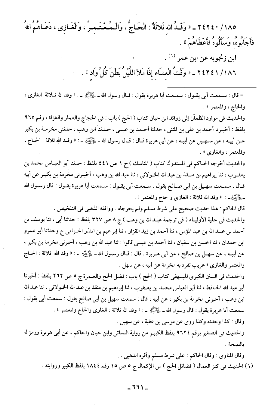 185/ 24240 - "وَفْدُ اللهِ ثَلاثَةٌ: الْحَاجُّ، وَالْمُعْتَمِرُ، وَالْغَازِي، دَعَاهُمُ اللهُ فأَجَابُوهُ، وَسَأَلُوهُ فأَعْطَاهُمْ".