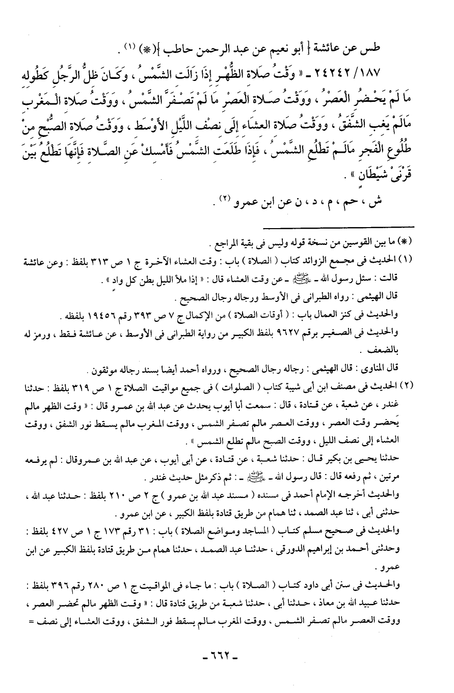187/ 24242 - "وَقْتُ صَلاةِ الظُّهْرِ إِذَا زَالتِ الشَّمْسُ، وَكَانَ ظِلُّ الرَّجُلِ كَطُولِهِ مَا لَمْ يَحْضُرِ الْعَصْرُ، وَوَقْتُ صَلاةِ الْعَصْرِ مَا لَمْ تَصْفَرَّ الشَّمْسُ، وَوَقْتُ صَلاةِ الْمَغْربِ مَا لَمْ يَغِبِ الشَّفَقُ، وَوَقْتُ صَلاةِ العِشَاءِ إِلَى نِصْفِ اللَّيلِ الأَوْسَطِ، وَوَقْتُ صَلاةِ الصُّبْحِ مِنْ طُلُوعِ الْفَجرِ مَا لَمْ تَطْلُعِ الشَّمْسُ، فَإِذَا طَلَعَتِ الشَّمْسُ فَأَمْسِكْ عَنِ الصَّلاةِ فَإِنَّهَا تَطْلُعُ بَينَ قَرْنَىْ شَيطَانٍ".