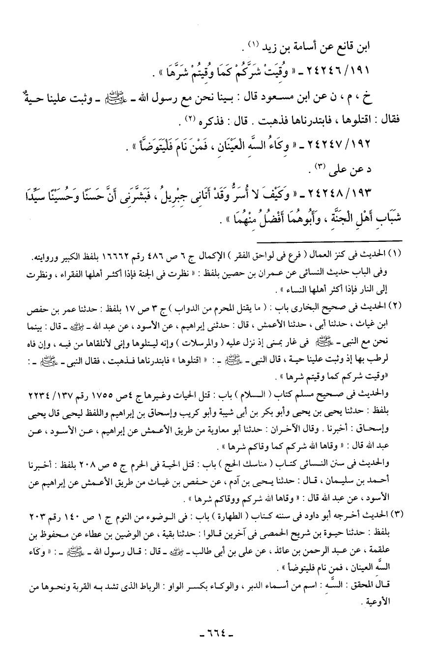 خ، م، ن عن ابن مسعود قال: بينا نحن مع رسول الله - صلى الله عليه وسلم - وثبت علينا حيةٌ فقال: اقتلوها، فابتدرناها فذهبت. قال: فذكره (¬2).