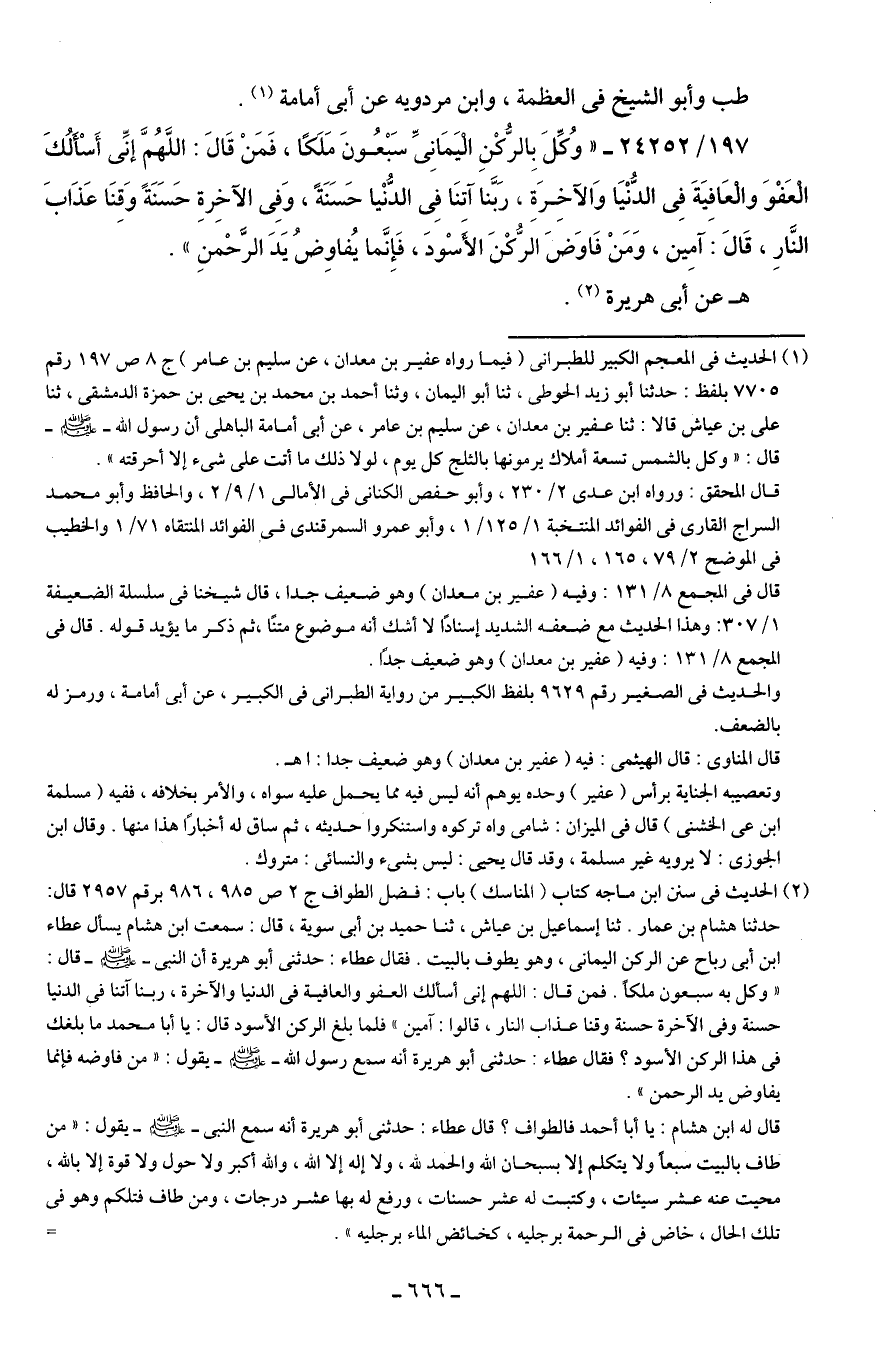 197/ 24252 - "وُكِّلَ بِالرُّكْنِ الْيَمَانِيِّ سَبْعُونَ مَلَكًا، فَمَنْ قَال: اللَّهُمَّ إنِّي أَسْأَلُكَ الْعَفْوَ والْعَافِيَةَ فِي الدُّنْيَا وَالآخِرَةِ، رَبَّنا آتِنَا فِي الدُّنْيا حَسَنَةً، وَفِي الآخِرةِ حَسَنَةً وَقِنَا عَذَابَ النَّارِ، قَال: آمِين، وَمَنْ فَاوَضَ الرُّكْنَ الأَسْودَ، فَإِنَّما يُفاوضُ يَدَ الرَّحْمنِ".