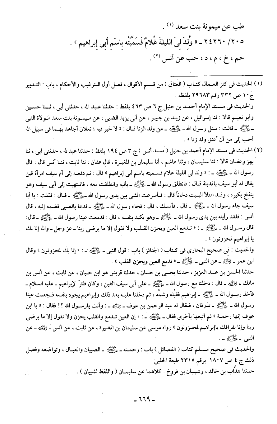 (¬2) الحديث في مسند الإمام أحمد بن حنبل (مسند أنس) ج 3 ص 194 بلفظ: حدثنا عبد لله، حدثني أبي، ثنا بهز وعفان قالا: ثنا سليمان، وثنا هاشم، أنا سليمان بن المغيرة، قال عفان: ثنا ثابت، ثنا أنس قال: قال رسول الله - صلى الله عليه وسلم -: "ولد لي الليلة غلام فسميته باسم أبي إبراهيم" قال: ثم دفعه إلى أم سيف امرأة قين يقال له أبو سيف بالمدينة قال: فانطلق رسول الله - صلى الله عليه وسلم - يأتيه وانطلقت معه، فانتهيت إلى أبي سيف وهو ينفخ بكيره، وقد امتلأ البيت دخانًا قال: فأسرعت المشي بين يدي رسول الله - صلى الله عليه وسلم - قال: فقلت: يا أبا سيف جاء رسول الله - صلى الله عليه وسلم - قال: فأمسك، قال: فجاء رسول الله - صلى الله عليه وسلم - فدعا بالصبي فضمه إليه، قال أنس: فلقد رأيته بين يدي رسول الله - صلى الله عليه وسلم - وهو يكيد بنفسه، قال: فدمعت عينا رسول الله - صلى الله عليه وسلم - قال: قال رسول الله - صلى الله عليه وسلم -: "تدمع العين ويحزن القلب ولا نقول إلا ما يرضى ربنا - عزَّ وجلَّ - والله إنا بك يا إبراهيم لمحزونون".