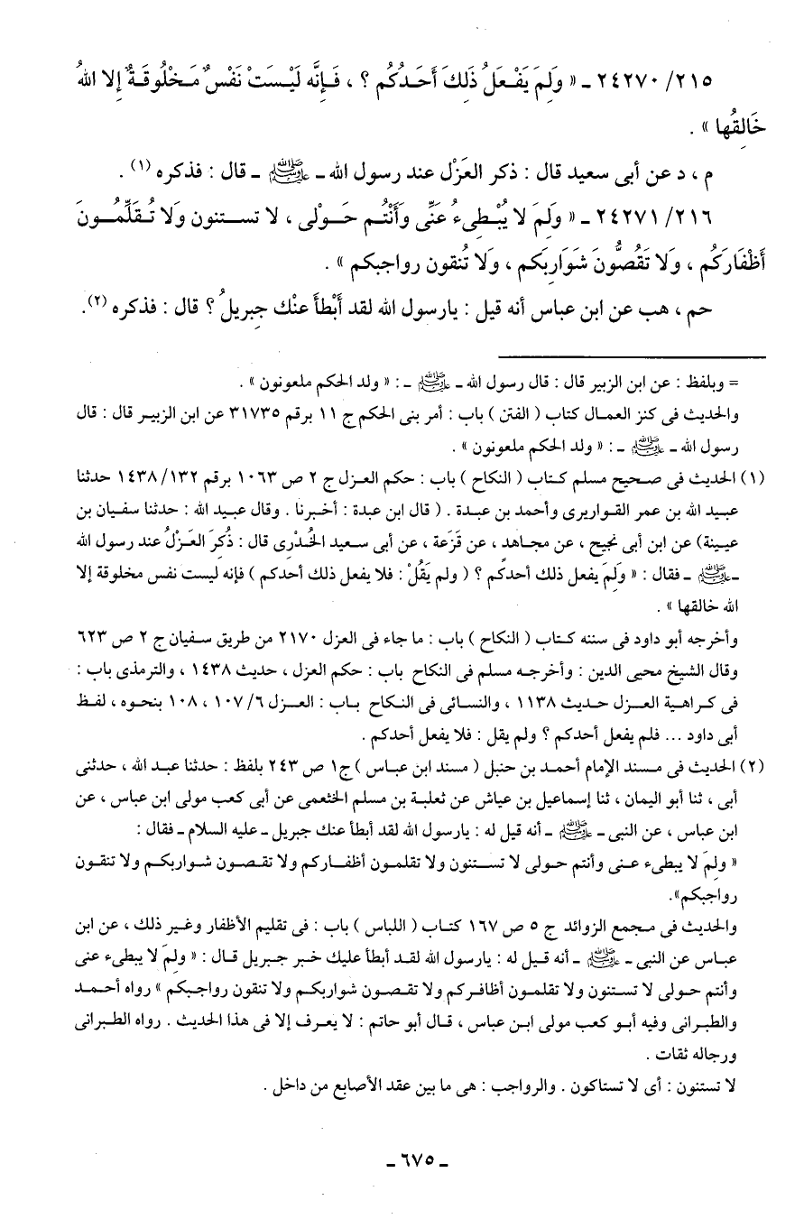 216/ 24271 - "وَلِمَ لا يُبْطِيءُ عَنِّي وَأَنْتُم حَوْلى، لا تستنون وَلا تُقَلِّمُونَ أَظْفَارَكُم، وَلا تَقُصُّونَ شَوَارِبَكم، وَلا تُنقون رواجبكم".