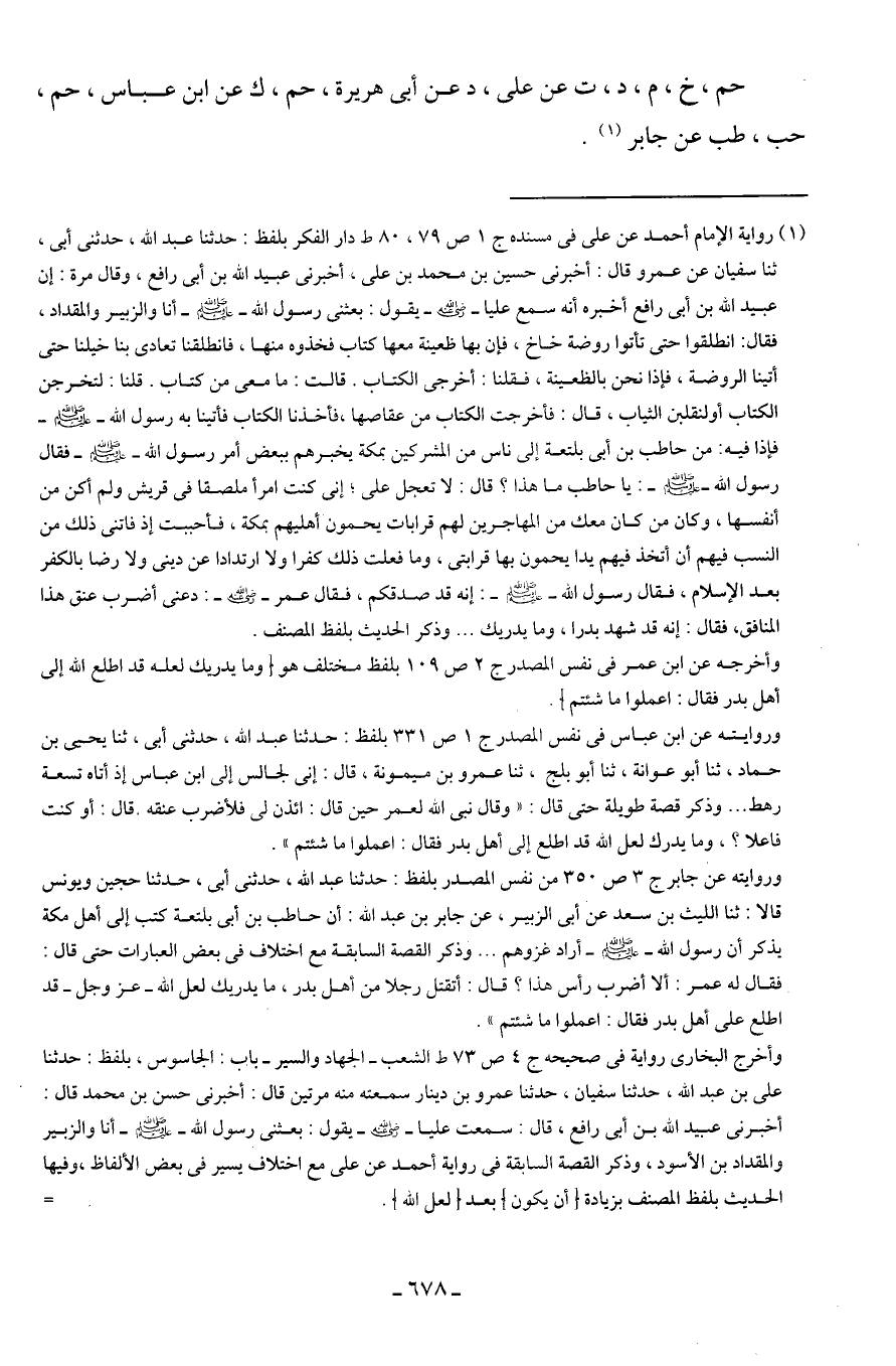 وروايته عن جابر ج 3 ص 350 من نفس المصدر بلفظ: حدثنا عبد الله، حدثني أبي، حدثنا حجين ويونس قالا: ثنا الليث بن سعد عن أبي الزبير، عن جابر بن عبد الله: أن حاطب بن أبي بلتعة كتب إلى أهل مكة يذكر أن رسول الله - صلى الله عليه وسلم - أراد غزوهم ... وذكر القصة السابقة مع اختلاف في بعض العبارات حتى قال: فقال له عمر: ألا أضرب رأس هذا؟ قال: أتقتل رجلا من أهل بدر، ما يدريك لعل الله - عزَّ وجلَّ - قد اطلع على أهل بدر فقال: اعملوا ما شئتم".