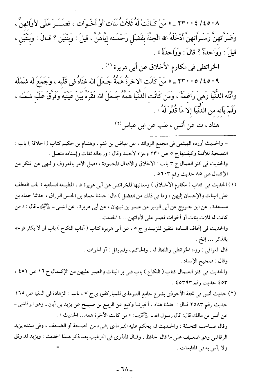 (¬1) الحديث في كتاب (مكارم الأخلاق) ومعاليها للخرائطى عن أبي هريرة ط، المطبعة السلفية (باب العطف على البنات والإحسان إليهن، وما في ذلك من الفضل) قال: حدثنا حماد بن الحسن الوراق، حدثنا حماد بن مسعدة، عن ابن جريج عن أبي الزبير عن عمر بن نبهان، عن أبي هريرة، عن النبي - صلى الله عليه وسلم - قال: "من كانت له ثلاث بنات أو أخوات فصبر على لأوائهن ... " الحديث.