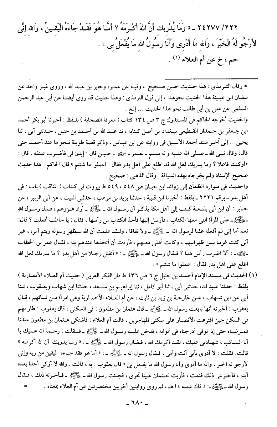 222/ 24277 - "وَمَا يُدْرِيكِ أَنَّ اللهَ أَكْرَمَهُ؟ أَمَّا هُوَ فَقَدْ جَاءَهُ الْيَقِينُ، وَاللهِ إِنِّي لأَرْجُو لَهُ الْخَيرَ، وَاللهِ مَا أَدْرِي وَأَنَا رسُولُ اللهِ مَا يُفْعَلُ بِي".