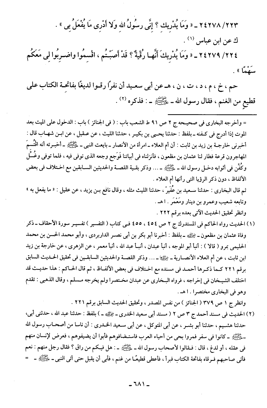 (¬2) الحديث في مسند أحمد ج 3 ص 2 (مسند أبي سعيد الخدري - رضي الله عنه -) بلفظ: حدثنا عبد الله، حدثني أبي، حدثنا هشيم، حدثنا أبو بشر، عن أبي المتوكل، عن أبي سعيد الخدري: أن ناسا من أصحاب رسول الله - صلى الله عليه وسلم - كانوا في سفر فمروا بحى من أحياء العرب فاستضافوهم فأبوا أن يضيفوهم، فعرض لإنسان منهم في عقله، أو لدغ، قال: فقالوا لأصحاب رسول الله - صلى الله عليه وسلم -: هل فيكم من راق؟ فقال رجل منهم: نعم فأتى صاحبهم فرقاه بفاتحة الكتاب فبرأ، فأعطى قطيعًا من غنم، فأبى أن يقبل حتى أتى النبي - صلى الله عليه وسلم - =