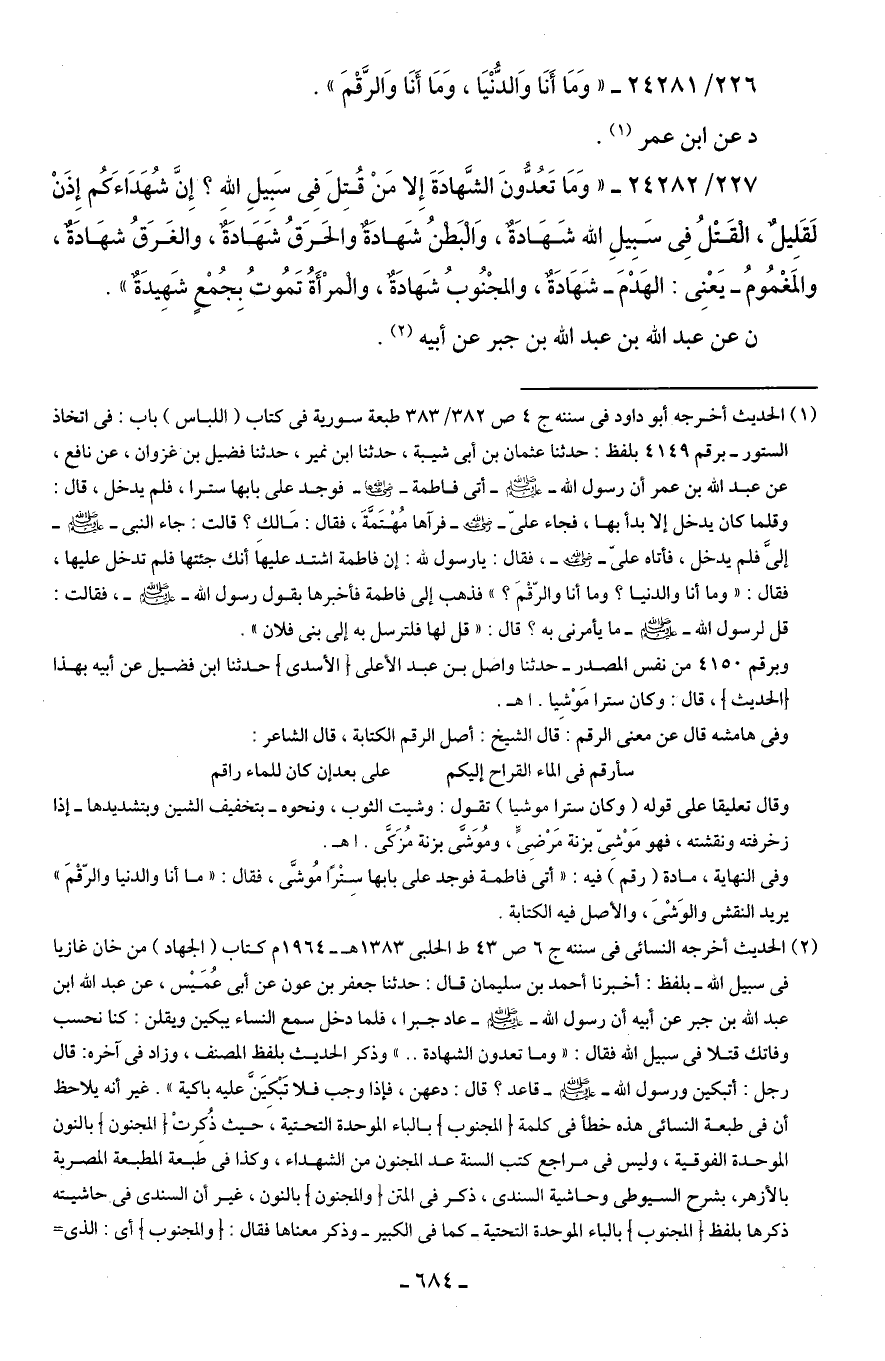 (¬2) الحديث أخرجه النسائي في سننه ج 6 ص 43 ط الحلبى 1383 هـ -1964 م كتاب (الجهاد) من خان غازيا في سبيل الله - بلفظ: أخبرنا أحمد بن سليمان قال: حدثنا جعفر بن عون عن أبي عُمَيس، عن عبد الله بن عبد الله بن جبر عن أبيه أن رسول الله - صلى الله عليه وسلم - عاد جبرا، فلما دخل سمع النساء يبكين ويقلن: كنا نحسب وفاتك قتلا في سبيل الله فقال: "وما تعدون الشهادة .. " وذكر الحديث بلفظ المصنف، وزاد في آخره: قال رجل: أتبكين ورسول الله - صلى الله عليه وسلم - قاعد؟ قال: دعهن، فإذا وجب فلا تَبْكِيَنَّ عليه باكية". غير أنه يلاحظ أن في طبعة النسائي هذه خطأ في كلمة {المجنوب} بالباء الموحدة التحتية، حيث ذُكِرتْ {المجنون} بالنون الموحدة الفوقية، وليس في مراجع كتب السنة عد المجنون من الشهداء، وكذا في طبعة المطبعة المصرية بالأزهر، بشرح السيوطي وحاشية السندى، ذكر في المتن {والمجنون} بالنون، غير أن السندى في حاشيته ذكرها بلفظ {المجنوب} بالباء الموحدة التحتية -كما في الكبير - وذكر معناها فقال: {والمجنوب} أي: الذي =