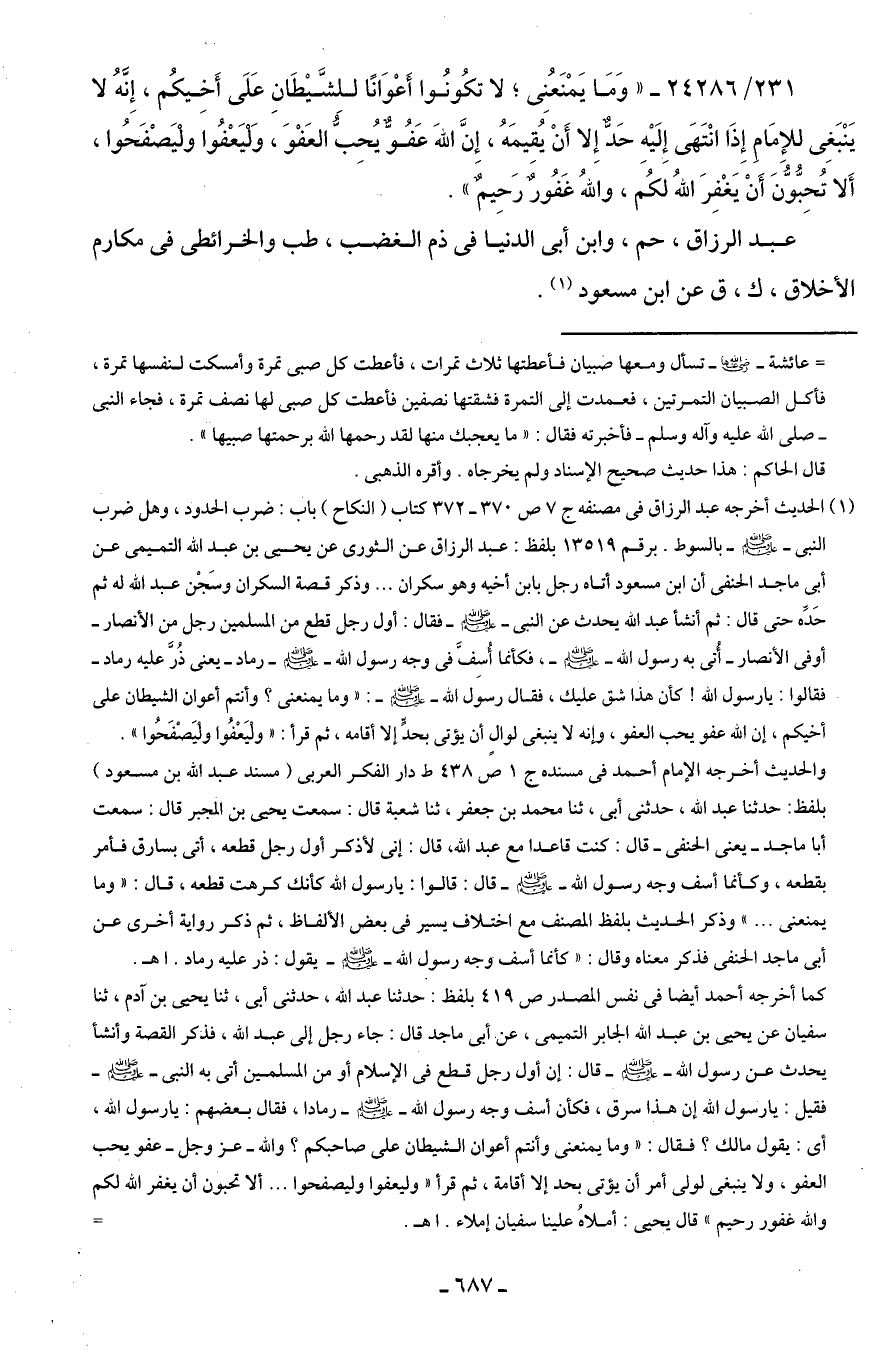 231/ 24286 - "وَمَا يَمْنَعُنِي، لا تكُونُوا أَعْوَانًا للشَّيطَانِ عَلَى أَخِيكُم، إِنَّهُ لا يَنْبَغِي للإمَامِ إِذَا انْتَهَى إِلَيه حَدٌّ إِلا أَنْ يُقيمَهُ، إِنَّ اللهَ عَفُوٌّ يُحِبُّ العَفْوَ، وَلْيَعْفُوا ولْيَصْفَحُوا، أَلا تُحِبُّوُّنَ أَنْ يَغْفِرَ اللهُ لكُمَ، واللهُ غَفُورٌ رَحِيمٌ".