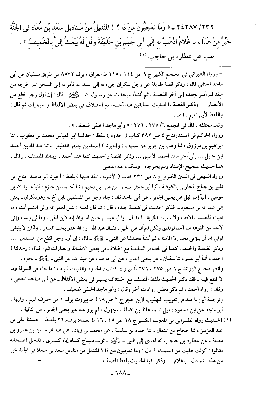 232/ 24287 - "وَمَا تَعْجَبُونَ مِنْ ذَا؟ ! المِنْدِيلُ مِنْ مَنَادِيلِ سَعْدِ بْنِ مُعَاذٍ فِي الجَنَّةِ خَيرٌ مِنْ هَذَا، يا غُلامُ اذْهَبْ بِهِ إلَى أَبِي جَهْمِ بْنِ حُذَيفَةَ وقُلْ لَهُ يَبْعَت إليَّ بِالْخَمِيصَةِ".