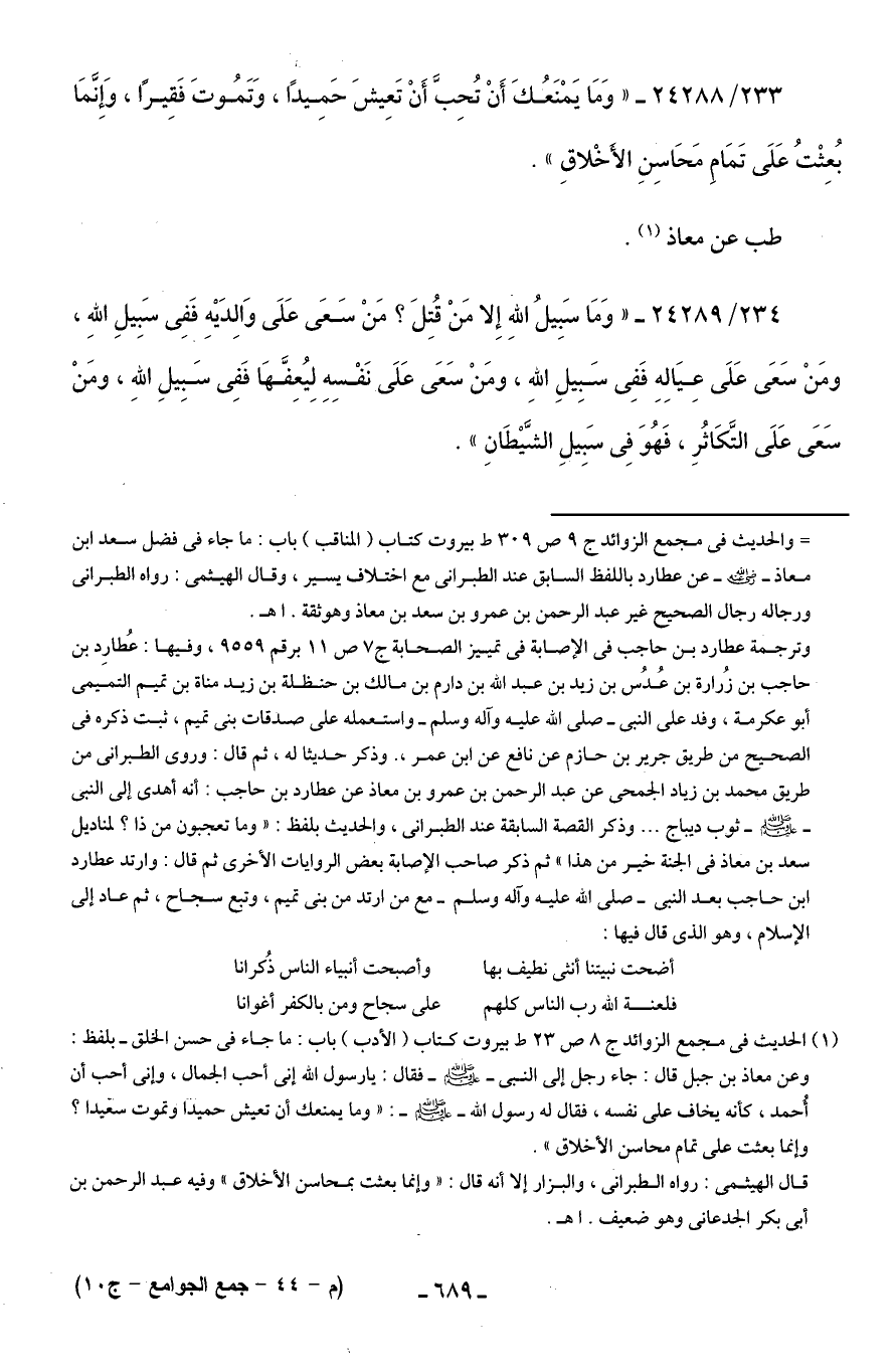 233/ 24288 - "وَمَا يَمْنَعُكَ أَنْ تُحِبَّ أَنْ تَعِيشَ حَمِيدًا، وَتَمُوتَ فَقِيرًا، وَإِنَّمَا بُعِثْتُ عَلَى تَمَامِ مَحَاسِنِ الأَخْلاقِ".