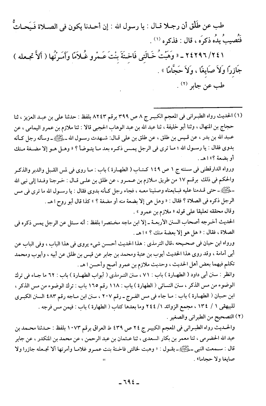 (¬1) الحديث رواه الطبراني في المعجم الكبير ج 8 ص 399 برقم 8243 بلفظ: حدثنا علي بن عبد العزيز، ثنا حجاج بن المنهال، وثنا أبو خليفة، ثنا عبد الله بن عبد الوهاب الحجبى قالا: ثنا ملازم بن عمرو اليمامي، عن عبد الله بن بدر، عن قيس بن طلق، عن طلق بن علي قال: شهدت رسول الله - صلى الله عليه وسلم - وسأله رجل كأنه بدوى فقال: يا رسول الله؛ ما ترى في الرجل يمس ذكره بعد ما يتوضأ؟ " وهل هو إلا مضغة منك أو بضعة؟ " اهـ.