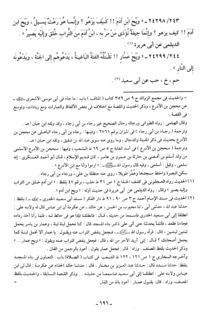 244/ 24299 - "وَيحَ عَمَّارٍ! ! تَقْتُلُهُ الفِئَةُ البَاغِيةُ، يَدْعُوهُم إِلى الجَنَّةِ، ويَدْعُونَه إِلى النَّارِ".