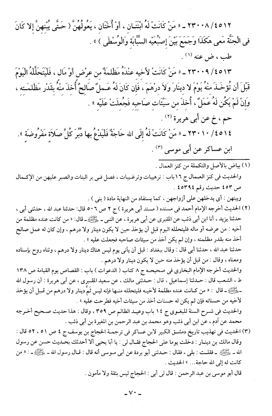 4513/ 23009 - "مَنْ كَانَتْ لأَخِيهِ عنْدَهُ مَظْلمَةٌ مِن عِرْضٍ أَوْ مَالٍ، فَلْيَتَحَلَّلْهُ الْيَوْمَ قَبْلَ أَن تُؤخَذَ مِنْهُ يَوْمَ لا دِينَارَ وَلَا دِرْهَمَ، فَإِن كَانَ لَهُ عَملٌ صَالِحٌ أُخِذَ مِنْهُ بِقَدْر مَظْلمَتِهِ، وَإِنْ لَمْ يَكُن لَهُ عَمَلٌ، أُخِذَ مِن سَيِّئَاتِ صَاحِبِهِ فَجُعِلَتْ عَلَيهِ".