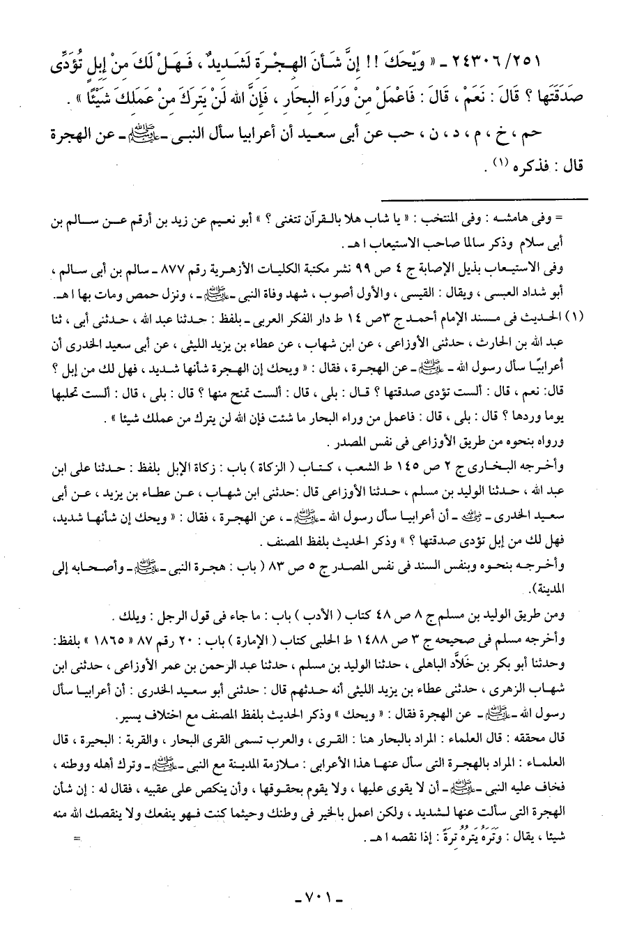 وأخرجه البخاري ج 2 ص 145 ط الشعب، كتاب (الزكاة) باب: زكاة الإبل بلفظ: حدثنا على ابن عبد الله، حدثنا الوليد بن مسلم، حدثنا الأوزاعي قال: حدثني ابن شهاب، عن عطاء بن يزيد، عن أبي سعيد الخدري - رضي الله عنه - أن أعرابيا سأل رسول الله - صلى الله عليه وسلم -، عن الهجرة، فقال: "ويحك إن شأنها شديد، فهل لك من إبل تؤدى صدقتها؟ " وذكر الحديث بلفظ المصنف.