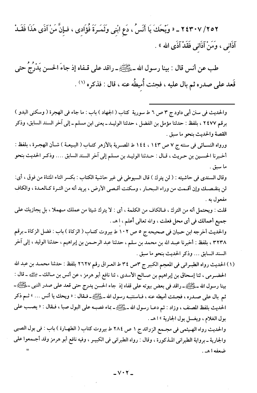 252/ 24307 - "وَيحَكَ يَا أَنَسُ، دَعِ ابْنِي وَثَمَرَةَ فُؤَادِي، فإِنَّ مَنْ آذَى هَذَا فَقَدْ آذَانِي، وَمَنْ آذَانِي فَقَدْ آذَى الله".