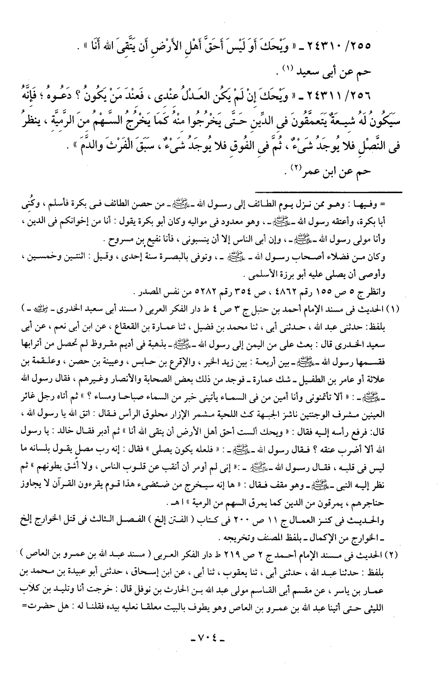 (¬1) الحديث في مسند الإمام أحمد بن حنبل ج 3 ص 4 ط دار الفكر العربي (مسند أبي سعيد الخدري - رضي الله عنه -) بلفظ: حدثني عبد الله، حدثني أبي، ثنا محمد بن فضيل، ثنا عمارة بن القعقاع، عن ابن أبي نعم، عن أبي سعيد الخدري قال: بعث على من اليمن إلى رسول الله - صلى الله عليه وسلم - بذهبة في أديم مقروظ لم تحصل من أترابها فقسمها رسول الله - صلى الله عليه وسلم - بين أربعة: بين زيد الخير، والأقرع بن حابس، وعيينة بن حصن، وعلقمة بن علاثة أو عامر بن الطفيل -شك عمارة- فوجد من ذلك بعض الصحابة والأنصار وغيرهم، فقال رسول الله - صلى الله عليه وسلم -: "ألا تأتمنونى وأنا أمين من في السماء يأتيني خبر من السماء صباحا ومساء؟ " ثم أتاه رجل غائر العينين مشرف الوجنتين ناشز الجبهة كث اللحية مشمر الإزار محلوق الرأس فقال: اتق الله يا رسول الله، قال: فرفع رأسه إليه فقال: "ويحك ألست أحق أهل الأرض أن يتقى الله أنا" ثم أدبر فقال خالد: يا رسول الله ألا أضرب عنقه؟ فقال رسول الله - صلى الله عليه وسلم -: "فلعله يكون يصلى" فقال: إنه رب مصلٍ يقول بلسانه ما ليس في قلبه، فقال رسول الله - صلى الله عليه وسلم -: "إني لم أؤمر أن أنقب عن قلوب الناس، ولا أشق بطونهم" ثم نظر إليه النبي - صلى الله عليه وسلم - وهو مقف فقال: "ها إنه سيخرج من ضئضئ هذا قوم يقرءون القرآن لا يجاوز حناجرهم، يمرقون من الدين كما يمرق السهم من الرمية " اهـ.
