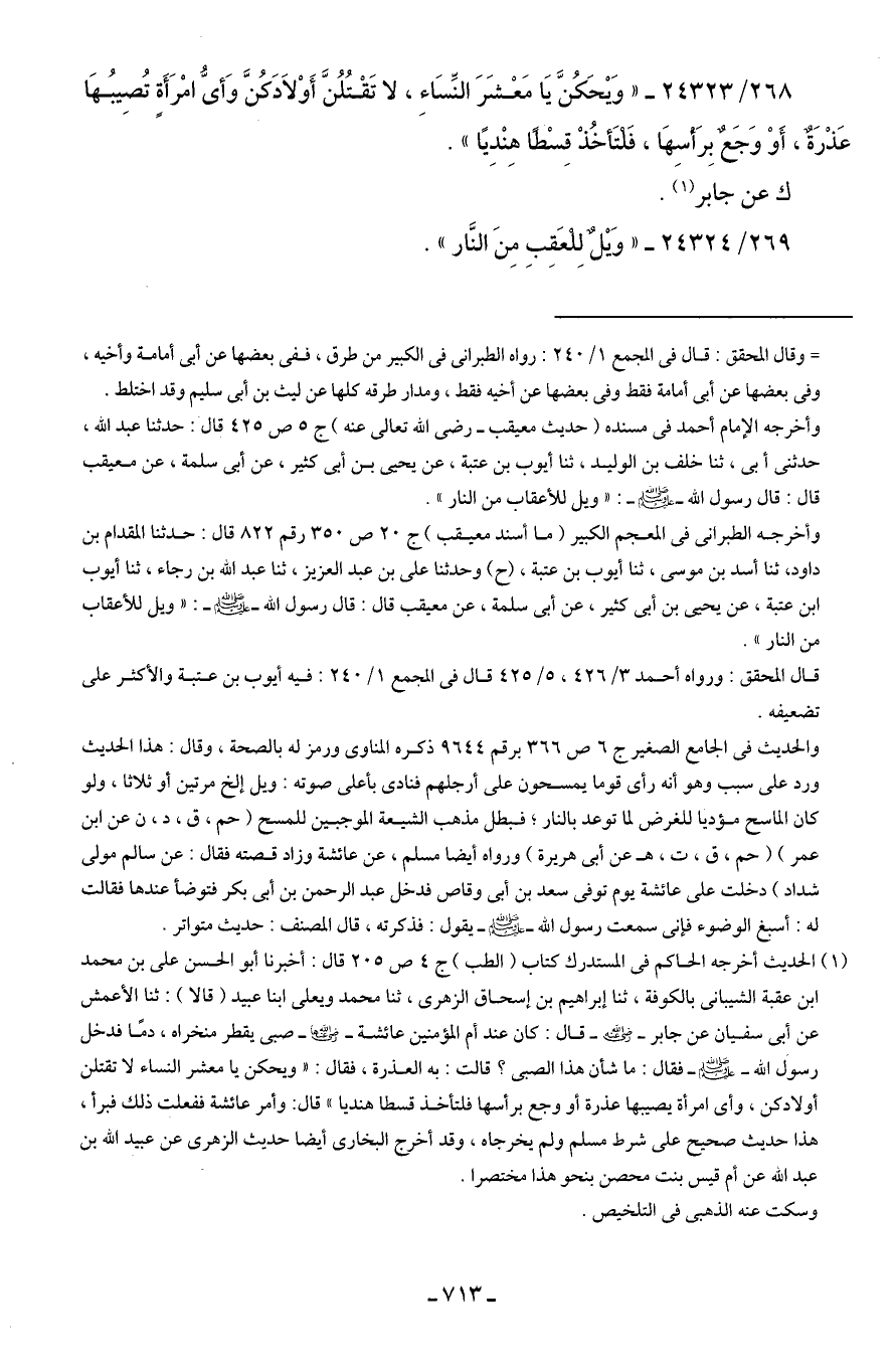 268/ 24323 - "وَيحَكُنَّ يَا مَعْشَرَ النِّسَاءِ، لا تَقْتُلُنَّ أَوْلادَكُنَّ وَأيُّ امْرَأَةٍ تُصِيبُهَا عَذْرَةٌ، أَوْ وَجَعٌ بِرَأْسِهَا، فَلْتَأخُذْ قِسْطًا هِنْدِيًّا".