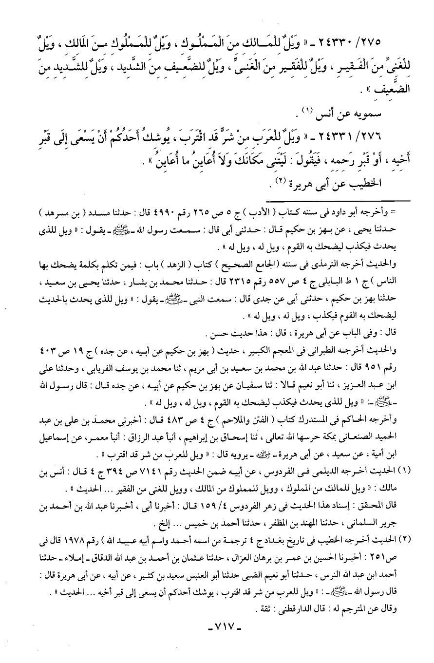 275/ 24330 - "وَيلٌ للْمَالِكِ مِنَ الْمَمْلُوك، وَيلٌ لِلْمَمْلُوكِ مِنَ المَالك، وَيلٌ لِلغَنيِّ مِنَ الْفَقِيرِ، وَيلٌ لِلفَقِيرِ مِنَ الْغَنِيِّ، وَيلٌ لِلضَّعِيفِ مِنَ الشَّدِيد، وَيلٌ لِلشَّدِيدِ مِنَ الضَّعِيفِ".