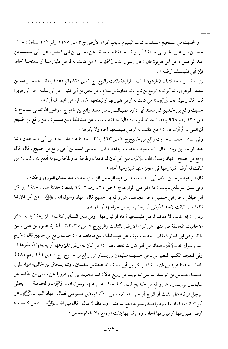وقال: "إذا كانت لأحدكم أرض فليمنحها أخاه أو ليزرعها" وفي سنن النسائي كتاب (المزارعة) باب: ذكر الأحاديث المختلفة في النهي عن كراء الأرض بالثلث والربع ج 7 ص 35 بلفظ: أخبرنا عمرو بن علي، عن خالد وهو ابن الحارث قال: حدثنا شعبة، عن عبد الملك عن مجاهد قال: حدث رافع بن خديج قال: خرج إلينا رسول الله - صلى الله عليه وسلم - فنهانا عن أمر كان لنا نافعا، فقال: "من كان له أرض فليزرعها أو يمنحها أو يذرها".