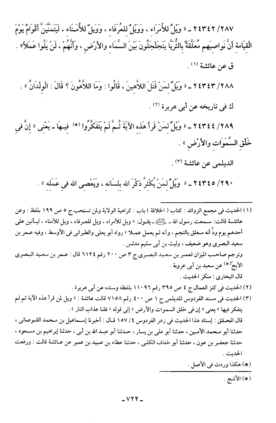 287/ 24342 - "وَيْلٌ للأُمَرَاءِ، وَوَيلٌ لِلعُرَفَاءِ، وَوَيلٌ للأُمَنَاءِ، لَيَتَمَنَّيَنَّ أَقْوَامٌ يَوْمَ الْقِيَامةِ أَنَّ نَواصِيَهم مُعَلَّقَةٌ بِالثُّرَيَّا يَتَجَلْجَلُونَ بَينَ السَّمَاءِ والأَرْضِ، وَأَنَّهُمْ، لَنْ يَلُوا عَمَلًا".