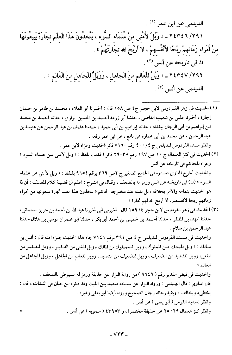 291/ 24346 - "وَيْلٌ لأُمَّتِي مِنْ عُلَمَاءِ السُّوءِ، يَتَّخِذُونَ هَذَا الْعِلم تِجَارَةً يَبِيعُونَهَا مِنْ أُمَراءِ زَمَانِهِمْ رِبْحًا لأنْفُسِهِمْ، لا أَرْبَحَ الله تِجَارَتَهُمْ".