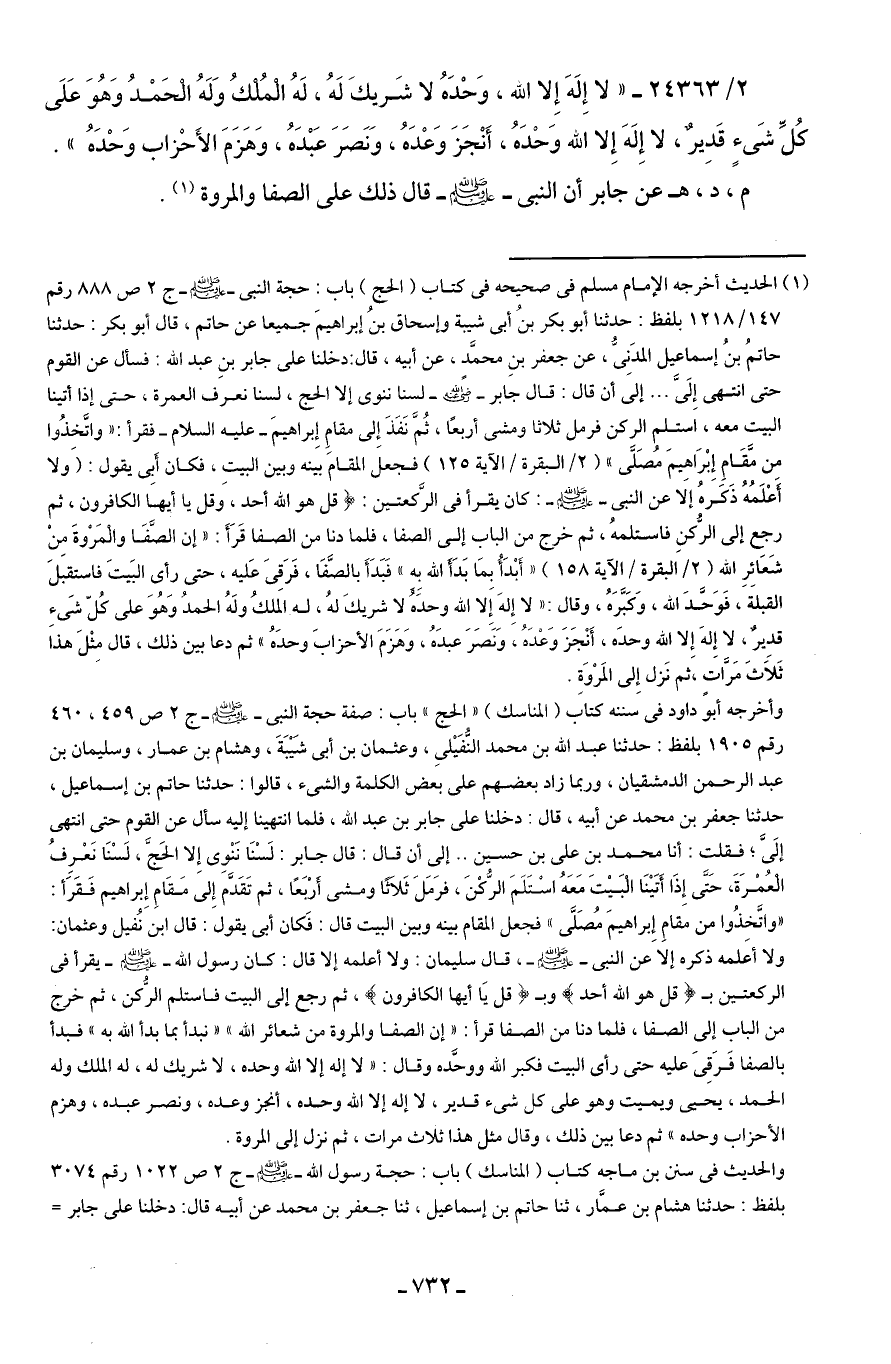 وأخرجه أبو داود في سننه كتاب (المناسك) "الحج " باب: صفة حجة النبي - صلى الله عليه وسلم - ج 2 ص 459، 460 رقم 1905 بلفظ: حدثنا عبد الله بن محمد النُّفَيلي، وعثمان بن أبي شَيبَةَ، وهشام بن عمار، وسليمان بن عبد الرحمن الدمشقيان، وربما زاد بعضهم على بعض الكلمة والشئ، قالوا: حدثنا حاتم بن إسماعيل، حدثنا جعفر بن محمد عن أبيه، قال: دخلنا على جابر بن عبد الله، فلما انتهينا إليه سأل عن القوم حتى انتهى إلَيَّ؛ فقلت: أنا محمد بن علي بن حسين .. إلى أن قال: قال جابر: لَسْنَا نَنْوى إِلا الحَجَّ، لَسْنَا نَعْرِفُ الْعُمْرَةَ، حَتَّى إِذَا أَتَينَا الْبَيتَ مَعَهُ اسْتَلَمَ الرُّكْنَ، فرَمَلَ ثَلاثًا ومشى أرْبَعًا، ثم تَقَدَّم إِلى مَقَامِ إِبراهيم فَقَرَأ: "واتَّخِذُوا من مقامِ إِبراهيمَ مُصَلَّى" فجعل المقام بينه وبين البيت قال: فَكان أبي يقول: قال ابن نُفيل وعثمان: ولا أعلمه ذكره إلا عن النبي - صلى الله عليه وسلم -، قال سليمان: ولا أعلمه إلا قال: كان رسول الله - صلى الله عليه وسلم - يقرأ في الركعتين بـ (قل هو الله أحد) وبـ (قل يَا أيها الكافرون)، ثم رجع إلى البيت فاستلم الرُّكن، ثم خرج من الباب إلى الصفا، فلما دنا من الصفا قرأ: "إن الصفا والمروة من شعائر الله" "نبدأ بما بدأ الله به" فبدأ بالصفا فَرَقِي عليه حتى رأى البيت فكبر الله ووحَّده وقال: "لا إله إلا الله وحده، لا شريك له، له الملك وله الحمد، يحيي ويميت وهو على كل شيء قدير، لا إله إلا الله وحده، أنجز وعده، ونصر عبده، وهزم الأحزاب وحده" ثم دعا بين ذلك، وقال مثل هذا ثلاث مرات، ثم نزل إلى المروة.