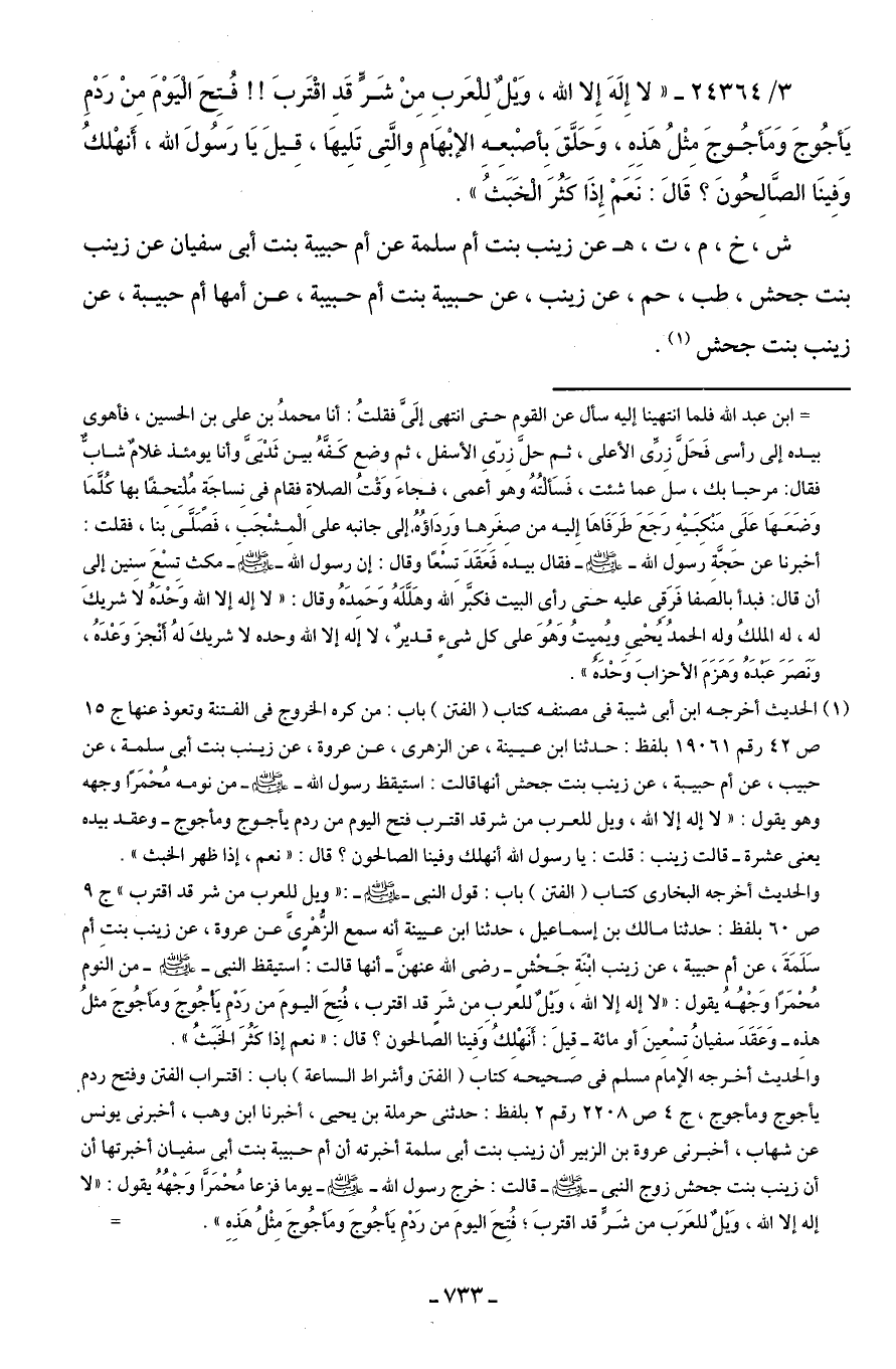 (¬1) الحديث أخرجه ابن أبي شيبة في مصنفه كتاب (الفتن) باب: من كره الخروج في الفتنة وتعوذ عنها ج 15 ص 42 رقم 19061 بلفظ: حدثنا ابن عيينة، عن الزهري، عن عروة، عن زينب بنت أبي سلمة، عن حبيب، عن أم حبيبة، عن زينب بنت جحش أنها قالت: استيقظ رسول الله - صلى الله عليه وسلم - من نومه مُحْمَرًا وجهه وهو يقول: "لا إله إلا الله، ويل للعرب من شر قد اقترب فتح اليوم من ردم يأجوج ومأجوج- وعقد بيده يعني عشرة- قالت زينب: قلت: يا رسول الله أنهلك وفينا الصالحون؟ قال: "نعم، إذا ظهر الخبث".