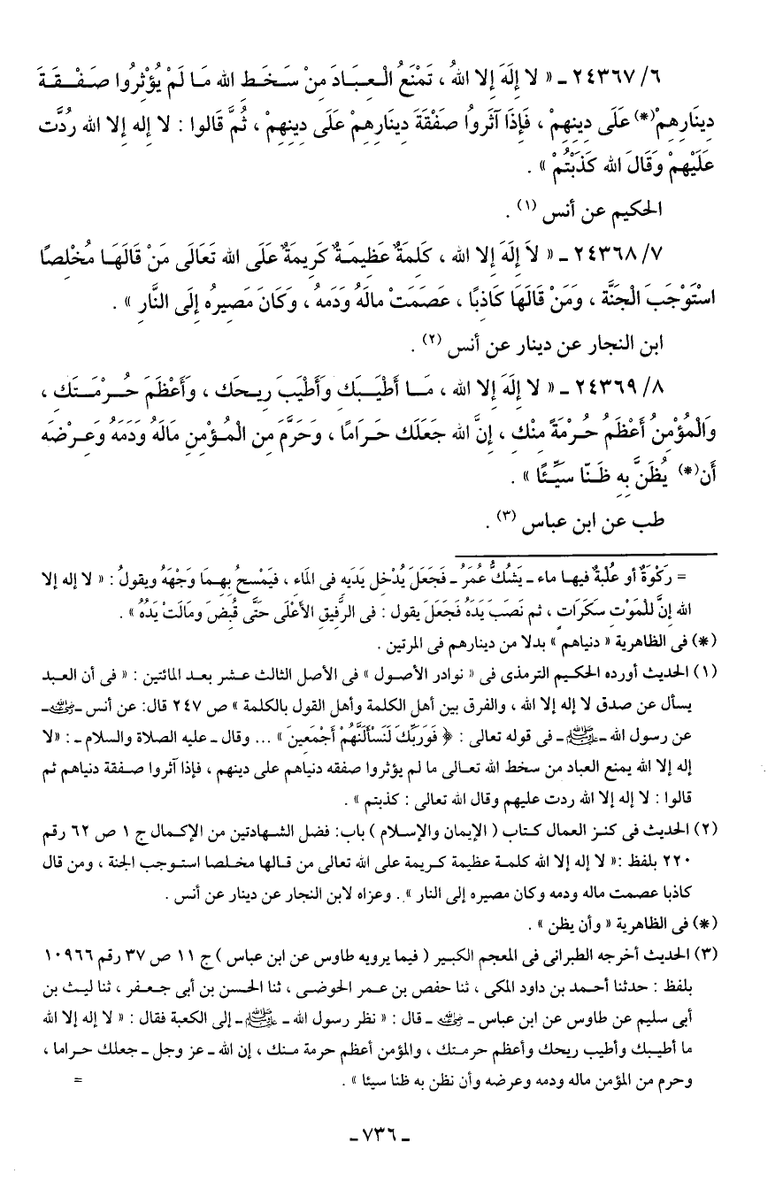 7/ 24368 - "لَا إِلَهَ إِلا الله، كَلِمَةٌ عَظِيمَةكَرِيمَة عَلَى الله تَعَالى مَنْ قَالهَا مُخْلِصًا اسْتَوْجَبَ الْجَنَّة، وَمَنْ قَالهَا كَاذِبًا، عَصَمَتْ مالهُ وَدَمهُ، وَكَانَ مَصِيرُه إِلَى النَّارِ".