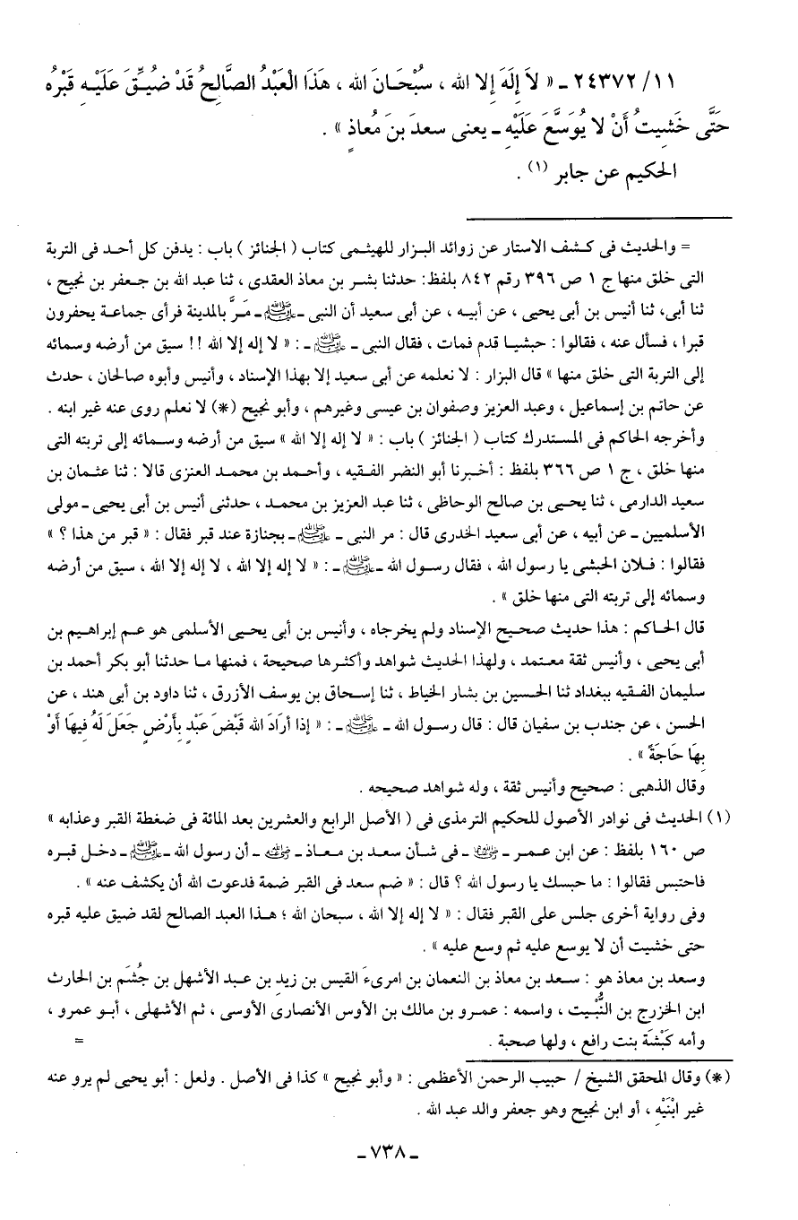 11/ 24372 - "لَا إِلَهَ إِلا الله، سُبْحَانَ الله، هَذَا الْعَبْدُ الصَّالِحُ قَدْ ضُيِّقَ عَلَيهِ قَبْرُه حَتَّى خَشِيتُ أَنْ لا يُوَسَّعَ عَلَيهِ- يعني سعدَ بنَ مُعاذٍ".