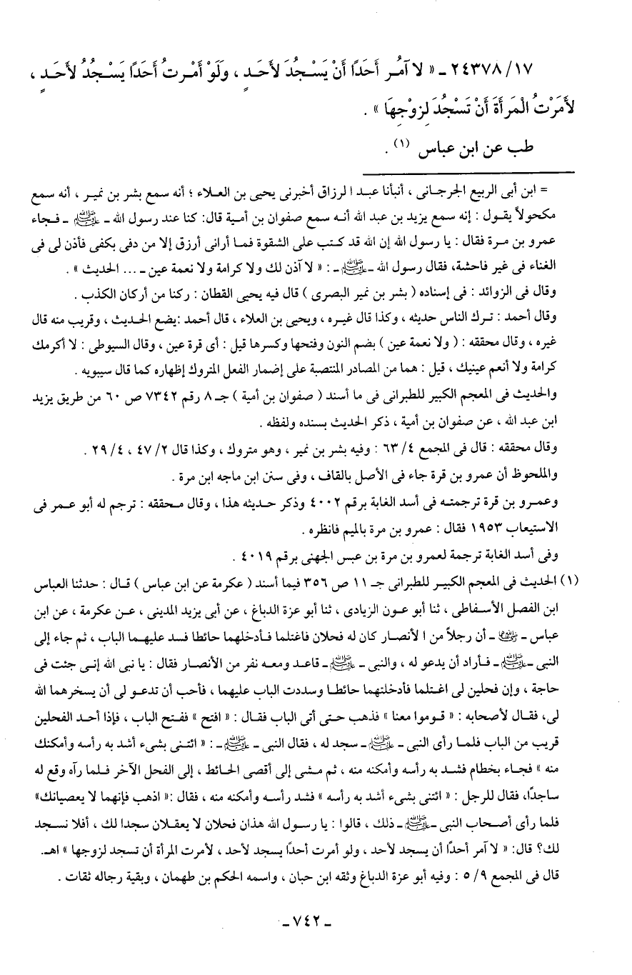 17/ 24378 - "لا آمُر أَحَدًا أَنْ يَسْجُدَ لأحَدٍ، وَلَوْ أَمْرتُ أَحَدًا يَسْجُدُ لأحَدٍ، لأَمَرْتُ الْمَرأَةَ أَنْ تَسْجُدَ لِزوْجِهَا".