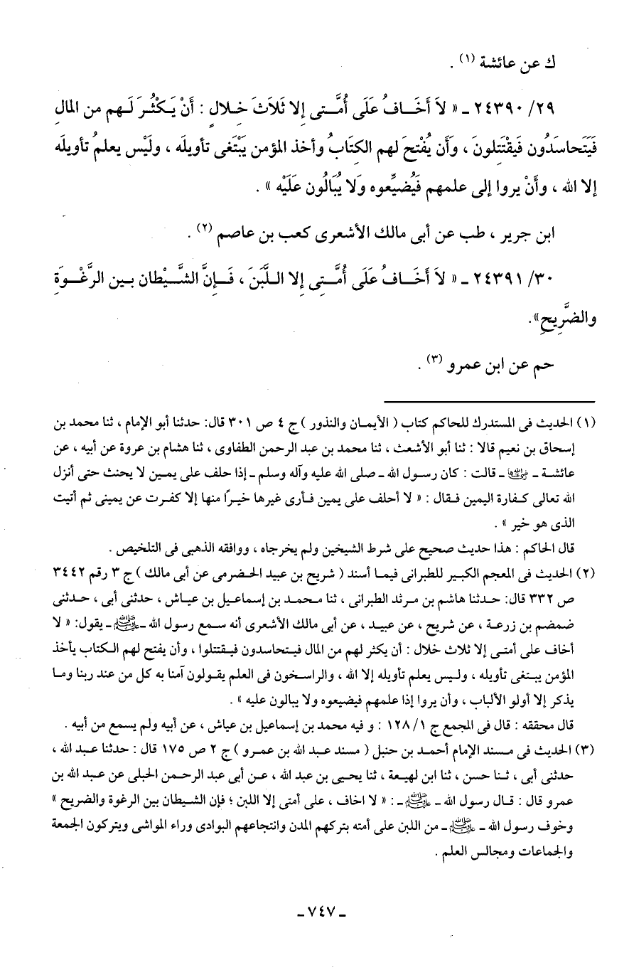 (¬2) الحديث في المعجم الكبير للطبراني فيما أسند (شريح بن عبيد الحضرمي عن أبي مالك) ج 3 رقم 3442 ص 332 قال: حدثنا هاشم بن مرثد الطبراني، ثنا محمد بن إسماعيل بن عياش، حدثني أبي، حدثني ضمضم بن زرعة، عن شريح، عن عبيد، عن أبي مالك الأشعري أنه سمع رسول الله - صلى الله عليه وسلم - يقول: "لا أخاف على أمتي إلا ثلاث خلال: أن يكثر لهم من المال فيتحاسدون فيقتتلوا، وأن يفتح لهم الكتاب يأخذ المؤمن يبتغى تأويله، وليس يعلم تأويله إلا الله، والراسخون في العلم يقولون آمنا به كل من عند ربنا وما يذكر إلا أولو الألباب، وأن يروا إذا علمهم فيضيعوه ولا يبالون عليه".