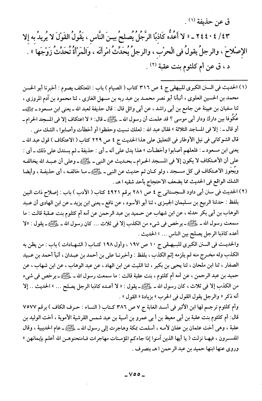 43/ 24404 - "لا أَعُدُّه كاذِبًا الرَّجُلُ يُصلحُ بينَ النَّاسِ، يَقُولُ القَوْلَ لا يُريدُ بِه إِلا الإِصْلاحَ، والرجلُ يقولُ في الحرْبِ، والرجلُ يُحَدِّثُ امْرأَتَه، وَالمَرْأَةُ تُحَدِّثُ زَوْجَها".