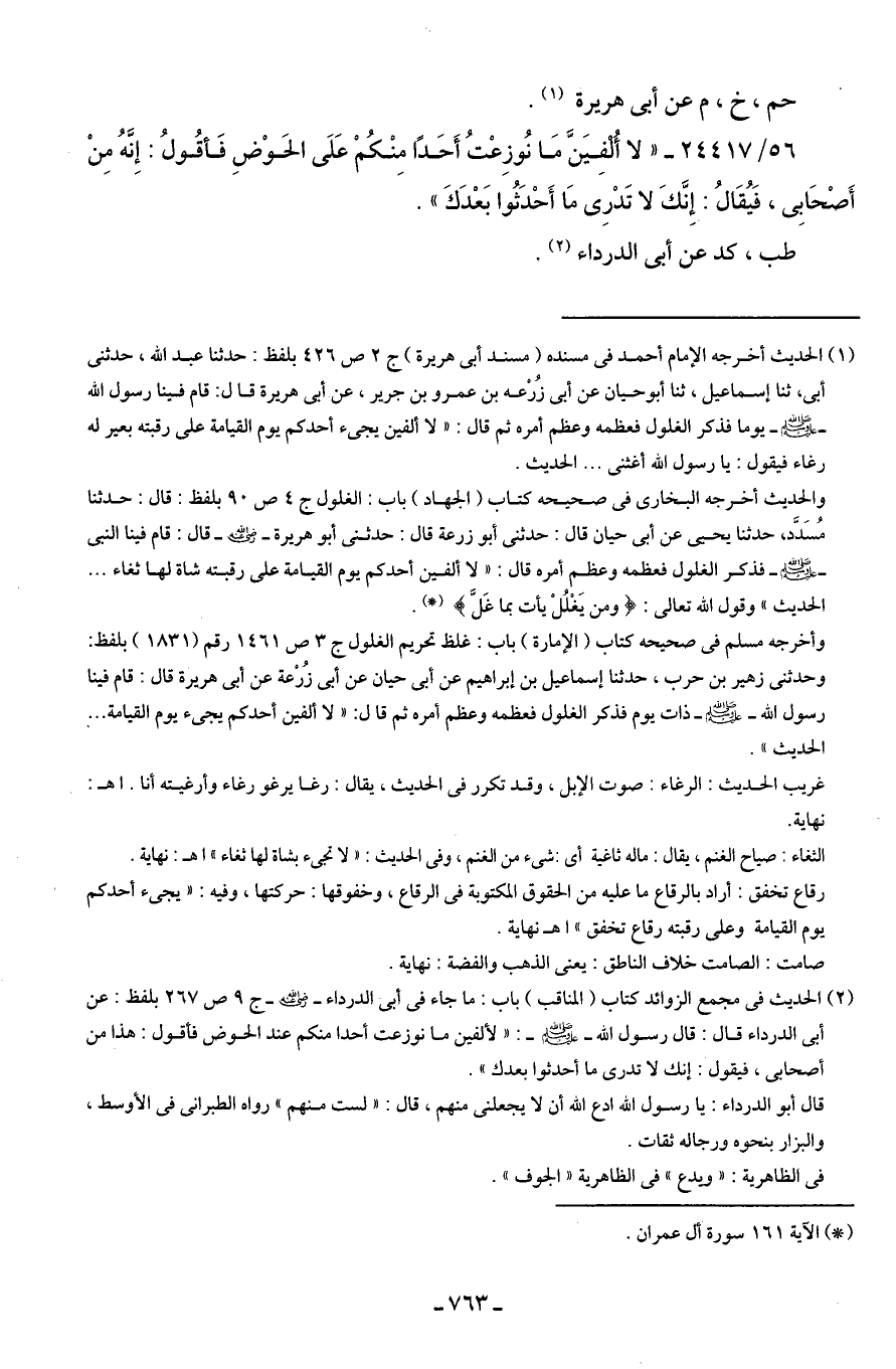 والحديث أخرجه البخاري في صحيحه كتاب (الجهاد) باب: الغلول ج 4 ص 90 بلفظ: قال: حدثنا مُسَدَّد، حدثنا يحيى عن أبي حيان قال: حدثني أبو زرعة قال: حدثني أبو هريرة - رضي الله عنه - قال: قام فينا النبي - صلى الله عليه وسلم - فذكر الغلول فعظمه وعظم أمره قال: "لا ألفين أحدكم يوم القيامة على رقبته شاة لها ثغاء ... الحديث" وقول الله تعالى: {وَمَنْ يَغْلُلْ يَأْتِ بِمَا غَلَّ} (*).