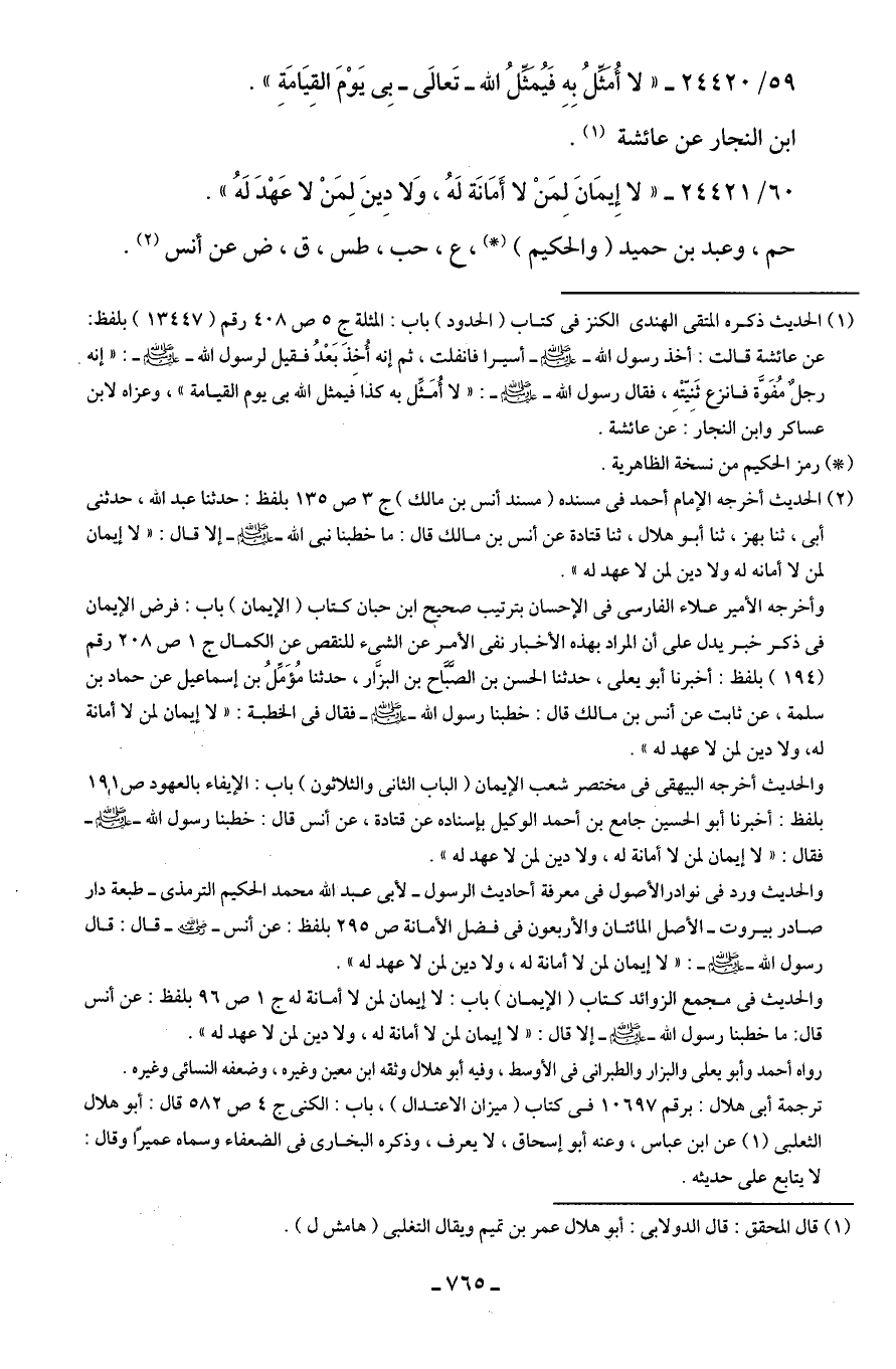 60/ 24421 - "لا إِيمَانَ لِمَنْ لا أَمَانَة لَهُ، وَلا دِينَ لِمَنْ لا عَهْدَ لَهُ".