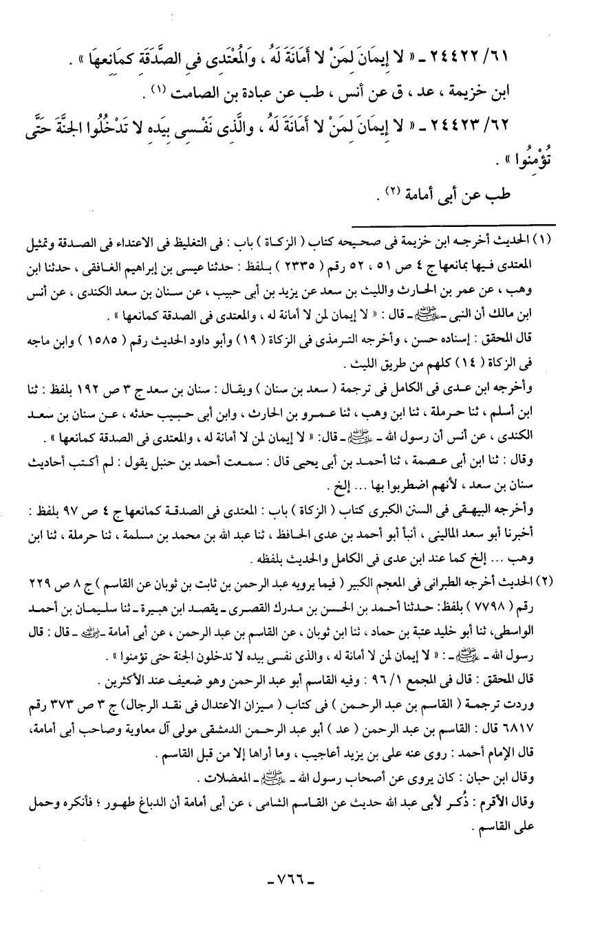 (¬1) الحديث أخرجه ابن خزيمة في صحيحه كتاب (الزكاة) باب: في التغليظ في الاعتداء في الصدقة وتمثيل المعتدى فيها بمانعها ج 4 ص 51، 52 رقم (2335) بلفظ: حدثنا عيسى بن إبراهيم الغافقى، حدثنا ابن وهب، عن عمر بن الحارث والليث بن سعد عن يزيد بن أبي حبيب، عن سنان بن سعد الكندى، عن أنس بن مالك أن النبي - صلى الله عليه وسلم - قال: "لا إيمان لمن لا أمانة له، والمعتدى في الصدقة كمانعها".