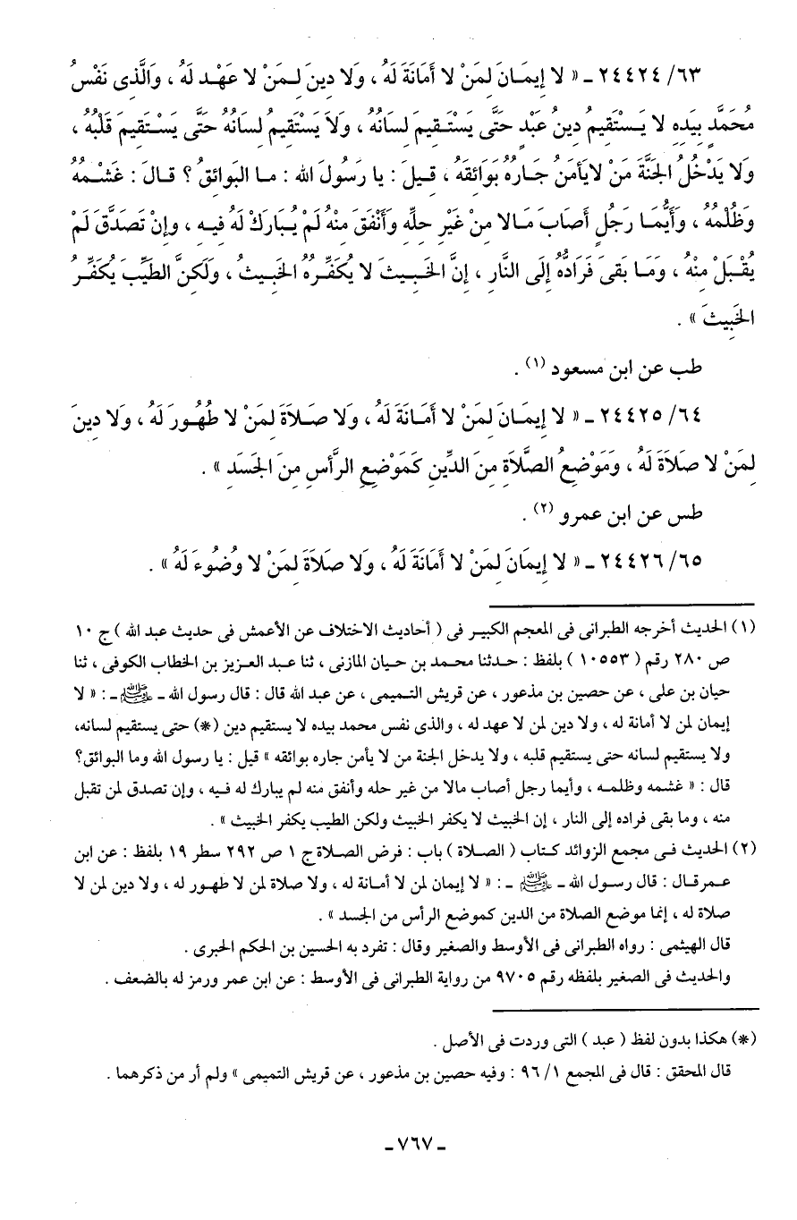 65/ 24426 - "لا إِيمَانَ لِمَنْ لا أَمَانَةَ لَهُ، وَلا صَلاةَ لِمَنْ لا وُضُوءَ لَهُ".