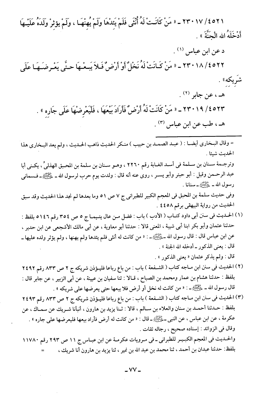 4521/ 23017 - "مَنْ كَانَتْ لَهُ أُنْثَى فَلَمْ يَئِدْهَا وَلَمْ يُهِنْهَا، وَلَمْ يؤثِرْ وَلَدَهُ عَلَيهَا أَدْخَلَهُ الله الْجَنَّةَ".
