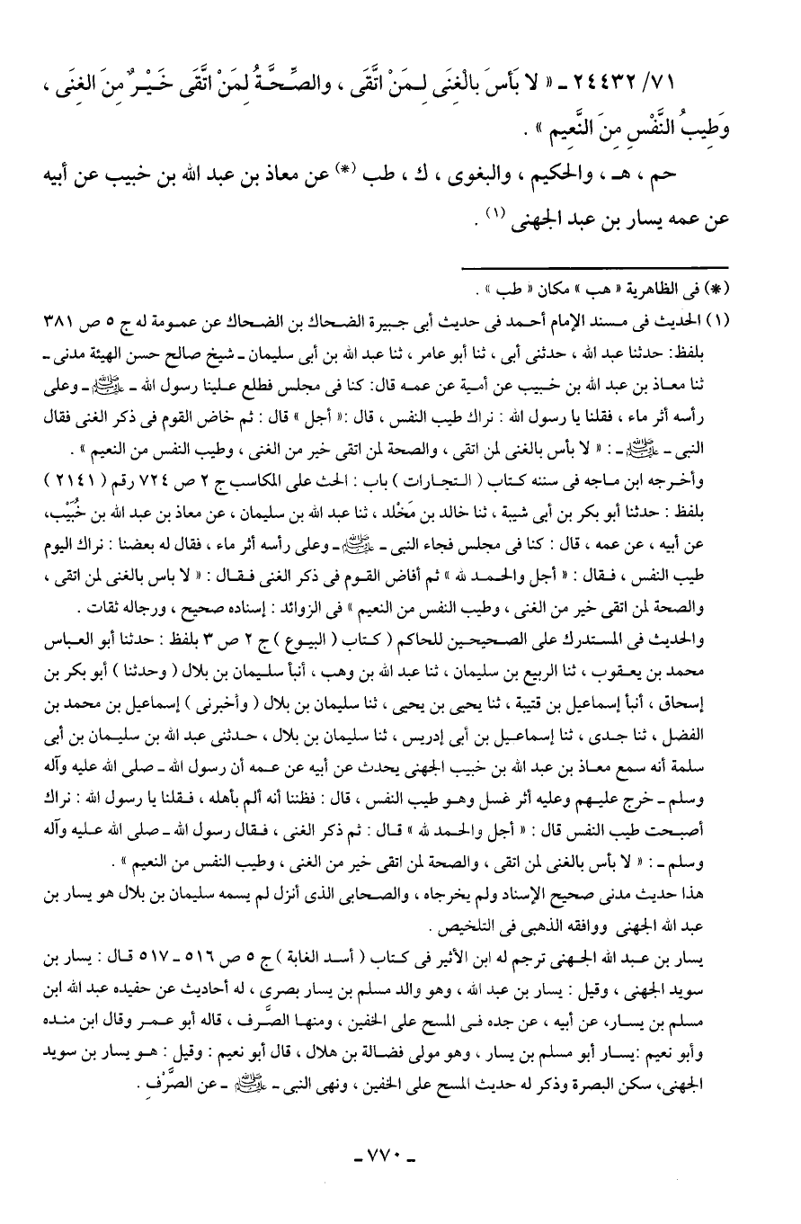 والحديث في المستدرك على الصحيحين للحاكم (كتاب (البيوع) ج 2 ص 3 بلفظ: حدثنا أبو العباس محمد بن يعقوب، ثنا الربيع بن سليمان، ثنا عبد الله بن وهب، أنبأ سليمان بن بلال (وحدثنا) أبو بكر بن إسحاق، أنبأ إسماعيل بن قتيبة، ثنا يحيى بن يحيى، ثنا سليمان بن بلال (وأخبرنى) إسماعيل بن محمد بن الفضل، ثنا جدى، ثنا إسماعيل بن أبي إدريس، ثنا سليمان بن بلال، حدثني عبد الله بن سليمان بن أبي سلمة أنه سمع معاذ بن عبد الله بن خبيب الجهني يحدث عن أبيه عن عمه أن رسول الله - صلى الله عليه وآله وسلم - خرج عليهم وعليه أثر غسل وهو طيب النفس، قال: فظننا أنه ألم بأهله، فقلنا يا رسول الله: نراك أصبحت طيب النفس قال: "أجل والحمد لله" قال: ثم ذكر الغنى، فقال رسول الله - صلى الله عليه واله وسلم -: "لا بأس بالغنى لمن اتقى، والصحة لمن اتقى خير من الغنى، وطيب النفس من النعيم".