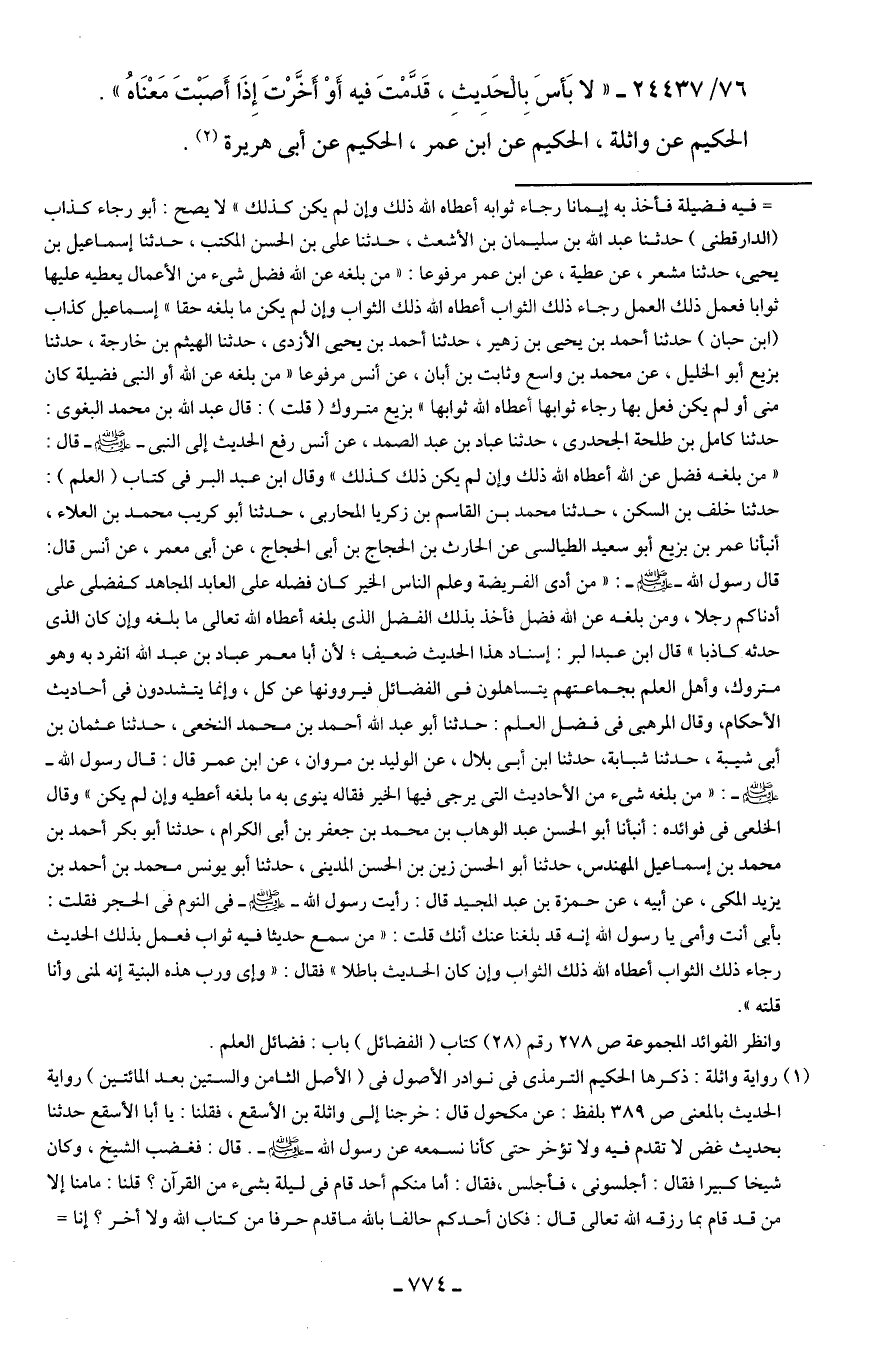 = فيه فضيلة فأخذ به إيمانا رجاء ثوابه أعطاه الله ذلك وإن لم يكن كذلك "لا يصح: أبو رجاء كذاب (الدارقطني) حدثنا عبد الله بن سليمان بن الأشعث، حدثنا علي بن الحسن الكتب، حدثنا إسماعيل بن يحيى، حدثنا مشعر، عن عطية، عن ابن عمر مرفوعًا: "من بلغه عن الله فضل شيء من الأعمال يعطيه عليها ثوابا فعمل ذلك العمل رجاء ذلك الثواب أعطاه الله ذلك الثواب وإن لم يكن ما بلغه حقا "إسماعيل كذاب (ابن حبان) حدثنا أحمد بن يحيى بن زهر، حدثنا أحمد بن يحيى الأزدي، حدثنا الهيثم بن خارجة، حدثنا بزيع أبو الخليل، عن محمد بن واسع وثابت بن أبان، عن أنس مرفوعًا "من بلغه عن الله أو النبي فضيلة كان منى أو لم يكن فعل بها رجاء ثوابها أعطاه الله ثوابها" بزيع متروك (قلت): قال عبد الله بن محمد البغوي: حدثنا كامل بن طلحة الجحدرى، حدثنا عباد بن عبد الصمد، عن أن رفع الحديث إلى النبي - صلى الله عليه وسلم - قال: "من بلغه فضل عن الله أعطاه الله ذلك وإن لم يكن ذلك كذلك" وقال ابن عبد البر في كتاب (العلم): حدثنا خلف بن السكن، حدثنا محمد بن القاسم بن زكريا المحاربى، حدثتا أبو كريب محمد بن العلاء، أنبأنا عمر بن بزيع أبو سعيد الطيالسي عن الحارث بن الحجاج بن أبي الحجاج، عن أبي معمر، عن أن قال: قال رسول الله - صلى الله عليه وسلم -: "من أدى الفريضة وعلم الناس الخير كان فضله على العابد المجاهد كفضلى على أدناكم رجلا، ومن بلغه عن الله فضل فأخذ بذلك الفضل الذي بلغه أعطاه الله تعالى ما بلغه وإن كان الذي حدثه كاذبا" قال ابن عبد البر: إسناد هذا الحديث ضعيف؛ لأن أبا معمر عباد بن عبد الله انفرد به وهو متروك، وأهل العلم بجماعتهم يتساهلون في الفضائل فيروونها عن كل، وإنما يتشددون في أحاديث الأحكام، وقال المرهبى في فضل العلم: حدثنا أبو عبد الله أحمد بن محمد النخعي، حدثنا عثمان بن أبي شيبة، حدثنا شبابة، حدثنا ابن أبي بلال، عن الوليد بن مروان، عن ابن عمر قال: قال رسول الله - صلى الله عليه وسلم -: "من بلغه شيء من الأحاديث التي يرجى فيها الخبر فقاله ينوى به ما بلغه أعطيه وإن لم يكن" وقال الخلعى في فوائده: أنبأنا أبو الحسن عبد الوهاب بن محمد بن جعفر بن أبي الكرام، حدثنا أبو بكر أحمد بن محمد بن إسماعيل المهندس، حدثنا أبو الحسن زين بن الحسن المديني، حدثنا أبو يونس محمد بن أحمد بن يزيد المكي، عن أبيه، عن حمزة بن عبد المجيد قال: رأيت رسول الله - صلى الله عليه وسلم - في النوم في الحجر فقلت: بأبي أنت وأمي يا رسول الله إنه قد بلغنا عنك أنك قلت: "من سمع حديثًا فيه ثواب فعمل بذلك الحديث رجاء ذلك الثواب أعطاه الله ذلك الثواب وإن كان الحديث باطلا" فقال: "وإى ورب هذه البنية إنه لمنى وأنا قلته".