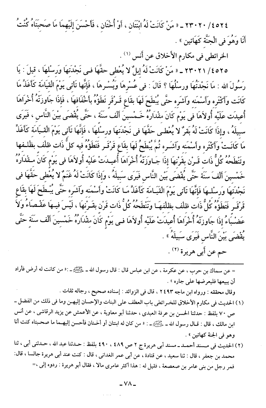 4525/ 23021 - "مَنْ كَانَتْ لَهُ إِبلٌ لا يُعْطِي حقَّهَا في نَجْدَتِهَا وَرِسْلِهَا، قِيلَ: يَا رَسُولَ الله: مَا نَجْدَتُهَا ورسْلُهَا؟ قَال: في عُسْرِهَا وَيُسْرهَا، فَإِنَّها تَأتِي يَوْمَ الْقِيَامَةِ كَأَغَذِّ مَا كَانَت وَأَكْثَرِهِ وَأَسْمَنِهِ وآشَرِهِ حتَّى يُبْطَحَ لَهَا بقَاعٍ قَرْقَرٍ تَطَؤُهُ بأَخْفَافِهَا، فَإِذَا جَاوزَتْهُ أُخْرَاهَا أُعِيدَت عَلَيهِ أُولَاهَا في يَوْم كَانَ مِقْدَارُهُ خَمْسِينَ أَلْف سَنَةٍ، حَتَّى يُقْضَى بينَ النَّاسِ، فَيَرَى سبِيلَهُ، وإِذَا كَانَتْ لَهُ بَقرٌ لا يُعْطى حَقَّهَا في نَجْدَتِهَا ورِسْلِهَا، فَإِنَّهَا تَأتِي يَوْمَ الْقِيَامَةِ كَأَغَذِّ مَا كَانَتْ وَأَكْثَرهِ وأَسْمَنِهِ وآشَرهِ ثُمَّ يُبْطَحُ لَهَا بِقَاعٍ قَرْقَر فَتَطَؤُهُ فِيه كلُّ ذَاتِ ظِلْفٍ بظْلفِها وتَنْطَحُهُ كُلُّ ذَاتِ قَرْن بِقَرْنِهَا إِذَا جَاوَزَتْهُ أُخْرَاهَا أُعِيدَتْ عَليهِ أُولَاهَا في يَوْمٍ كَانَ مِقدَارُهُ خَمْسِينَ أَلْفَ سَنَة حَتَّى يُقْضَى بَين النَّاسِ فَيَرَى سَبِيلَهُ، وَإِذَا كَانَتْ لَهُ غَنَمٌ لا يُعْطِي حَقَّهَا في نَجْدَتِهَا وَرِسْلِهَا فَإِنَّهَا تَأتى يَوْمَ الْقَيَامَةِ كَأَغَذِّ مَا كَانَتْ وأَسْمَنِهِ وآشَرِهِ حَتَّى يُبْطَحَ لَهَا بِقَاعٍ قَرْقَرٍ فَتَطَؤُهُ كُلُّ ذَاتِ ظِلْف بظِلْفِهَا وَتَنْطَحُهُ كُلُّ ذَاتِ قَرْنٍ بقَرْنِهَا، لَيسَ فِيهَا عَقْصَاءُ وَلَا عَضْبَاءُ إِذَا جَاوزَتْهُ أُخْرَاهَا أُعِيدَتْ عَلَيهِ أُولَاهَا في يَوْمٍ كَانَ مِقْدَارُهُ خَمْسِينَ أَلْف سَنَةٍ حَتَّى يُقْضَى بَينَ النَّاسِ فَيَرَى سَبيلَهُ".