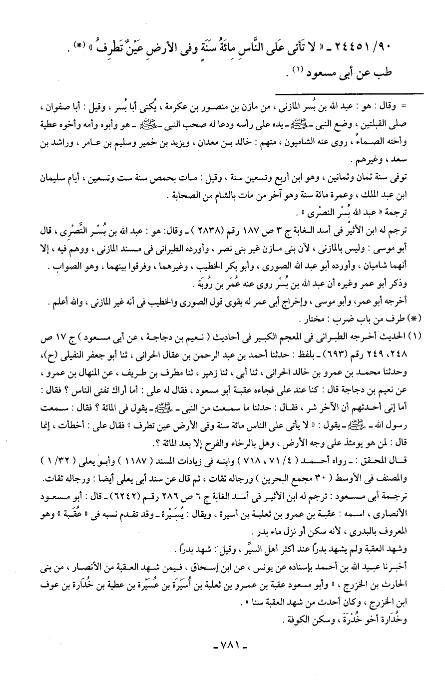 90/ 24451 - "لا تَأتى عَلى النَّاسِ مِائَةُ سَنَةٍ وفي الأرضِ عَينٌ تَطْرِفُ" (*).