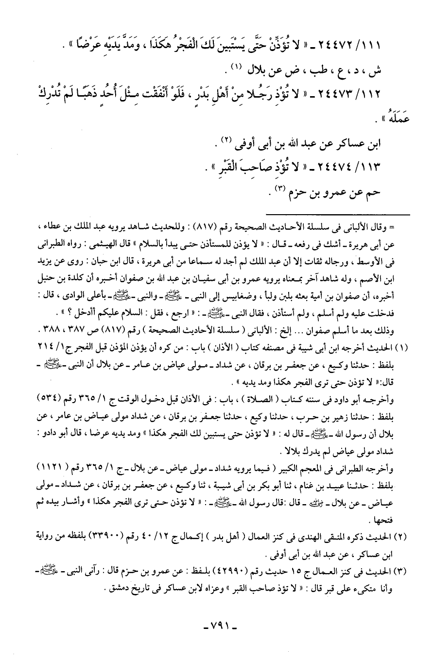 111/ 24472 - "لا تُؤَذِّنْ حَتَّى يَسْتَبينَ لَكَ الْفَجْرُ هَكَذَا، وَمَدَّ يَدَيهِ عَرْضًا".