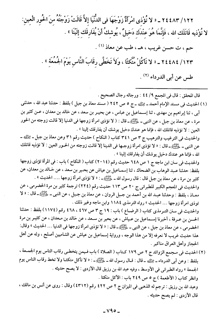 (¬1) الحديث في مسند الإمام أحمد - رضي الله عنه - ج 5 ص 242 (مسند معاذ بن جبل) بلفظ: حدثنا عبد الله، حدثني أبي، ثنا إبراهيم بن مهدي، ثنا إسماعيل بن عباس، عن بحير بن سعد، عن خالد بن معدان، عن كثير بن مرة، عن معاذ بن جبل، عن النبي - صلى الله عليه وسلم - قال: (لا تؤذى امرأة زوجها في الدنيا إلا قالت زوجته من الحور العين: لا تؤذيه قاتلك الله، فإنما هو عندك دخيل يوشك أن يفارقك إلينا".
