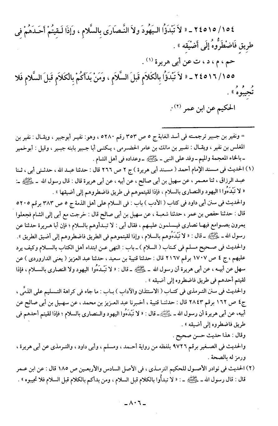 154/ 24515 - "لَا تَبْدَؤُا اليَهُودَ ولَا النَّصَارَى بِالسَّلامِ، وَإذَا لَقِيتُمْ أَحَدَهُمْ فِي طرِيقٍ فَاضْطَرُّوهُ إلَى أَضْيَقِه".