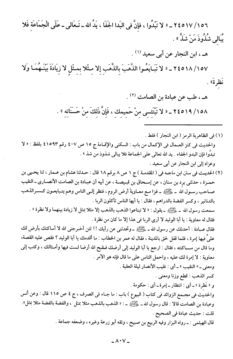 157/ 24518 - "لا تَبَايَعُوا الذَّهَبَ بِالذَّهَبِ إِلا مِثْلا بِمِثْلٍ لا زِيَادَةَ بَينَهُمَا وَلا نَظِرةَ".