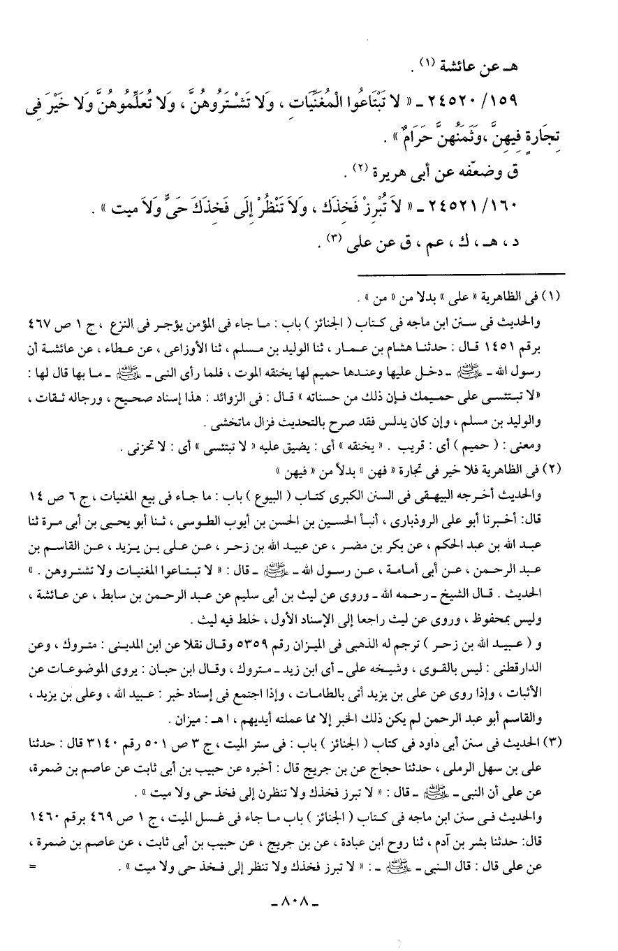 160/ 24521 - "لَا تُبْرِزْ فَخِذَك، وَلَا تَنْظُرْ إِلَى فَخِذَكَ حَيٍّ وَلَا ميت".