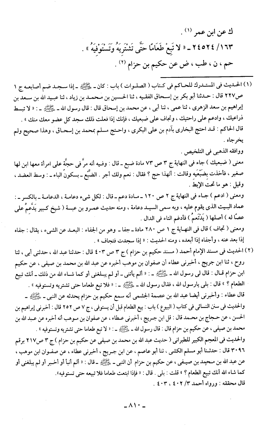 (¬2) الحديث في مسند الإمام أحمد (مسند حكيم بن حزام) ج 3 ص 403 قال: حدثنا عبد الله، حدثني أبي، ثنا روح، ثنا ابن جريج، أخبرني عطاء أن صفوان بن موهب أخبره عن عبد الله بن محمد بن صيفى، عن حكيم بن حزام قال: قال لي رسول الله - صلى الله عليه وسلم -: "ألم يأتنى -أو لم يبلغنى أو كما شاء الله من ذلك - أنك تبيع الطعام؟ " قال: بلى يا رسول الله، فقال رسول الله - صلى الله عليه وسلم -: "فلا تبع طعاما حتى تشتريه وتستوفيه".